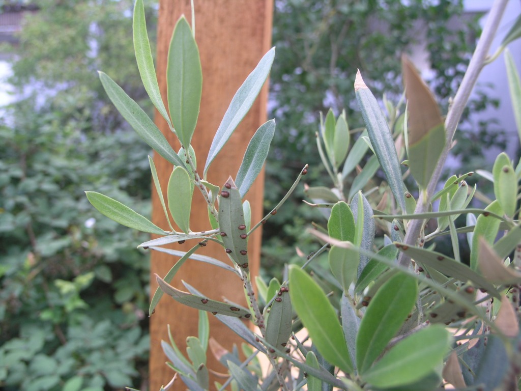 mein kleiner Olivenbaum wurde diesen Sommer von Spinnmilben heimgesucht. Seit einigen Wochen sind die zwar wieder weg, dafür sind jetzt an der Unterseite der Blätter hunderte dieser kleinen braunen Knubbel.