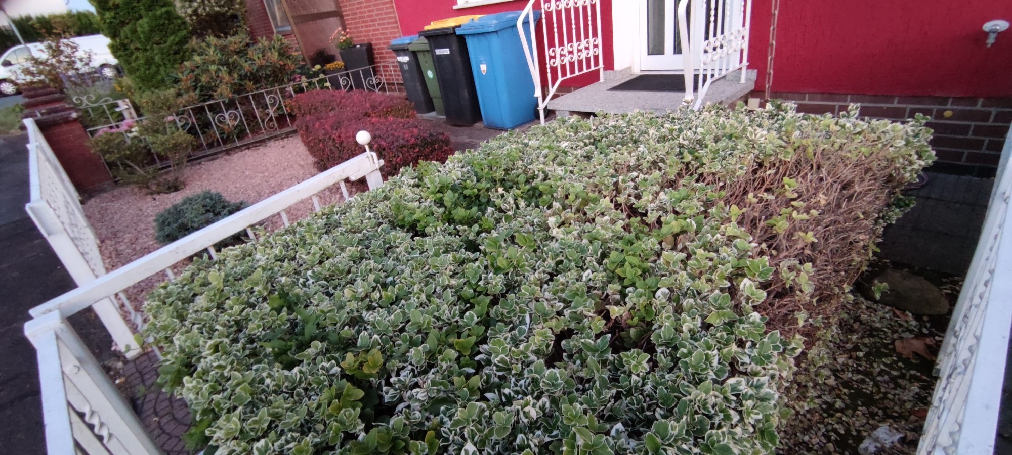Wir haben seit fast 50 Jahren einen Strauch bei uns im Vorgarten. Die Internet-Recherche ergab, dass es sich hierbei um einen Euonymus fortunei handelt, auch Kriechspindel bzw. Kletter-Spindelstrauch genannt.