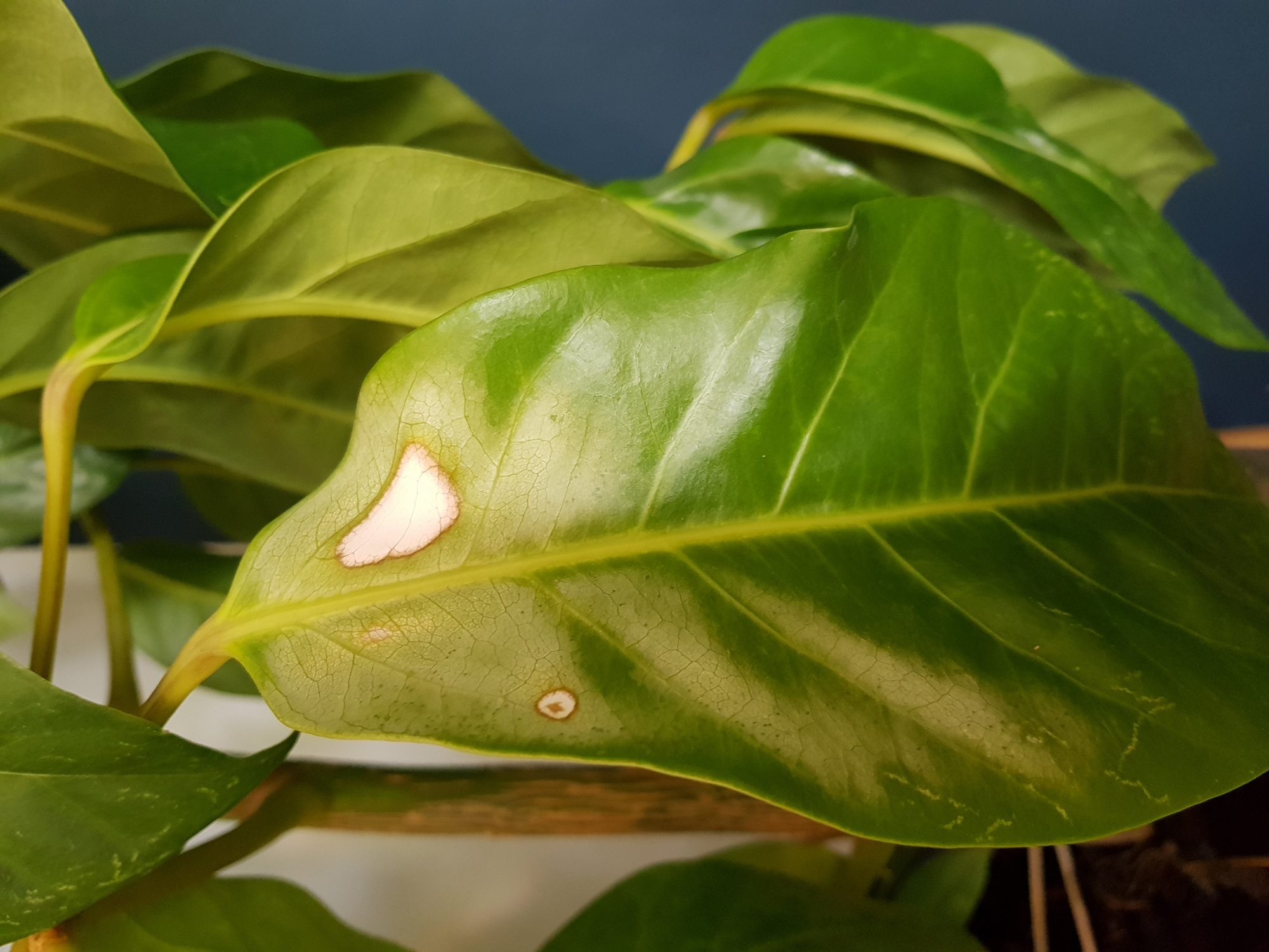 2. Dann bekommt sie silberne Blätter mit braunen Flecken. Einen Sonnenbrand kann ich ausschließen, sie steht eher dunkel und 3 Meter vom Südfenster entfernt.