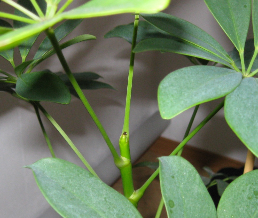seit etwa zwei Wochen gehen die neuen Blätter meiner Schefflera ein. Es fing an mit einem Blatt, das kleine braune Äderchen an der Unterseite hat. Beim zweiten Blatt sind nur noch drei der etwa sieben Blattteile groß geworden, die anderen verdörrt. Das letzte Blatt kam gar nicht mehr heraus, sondern wurde braun und klebrig (sieht aus wie Harz).