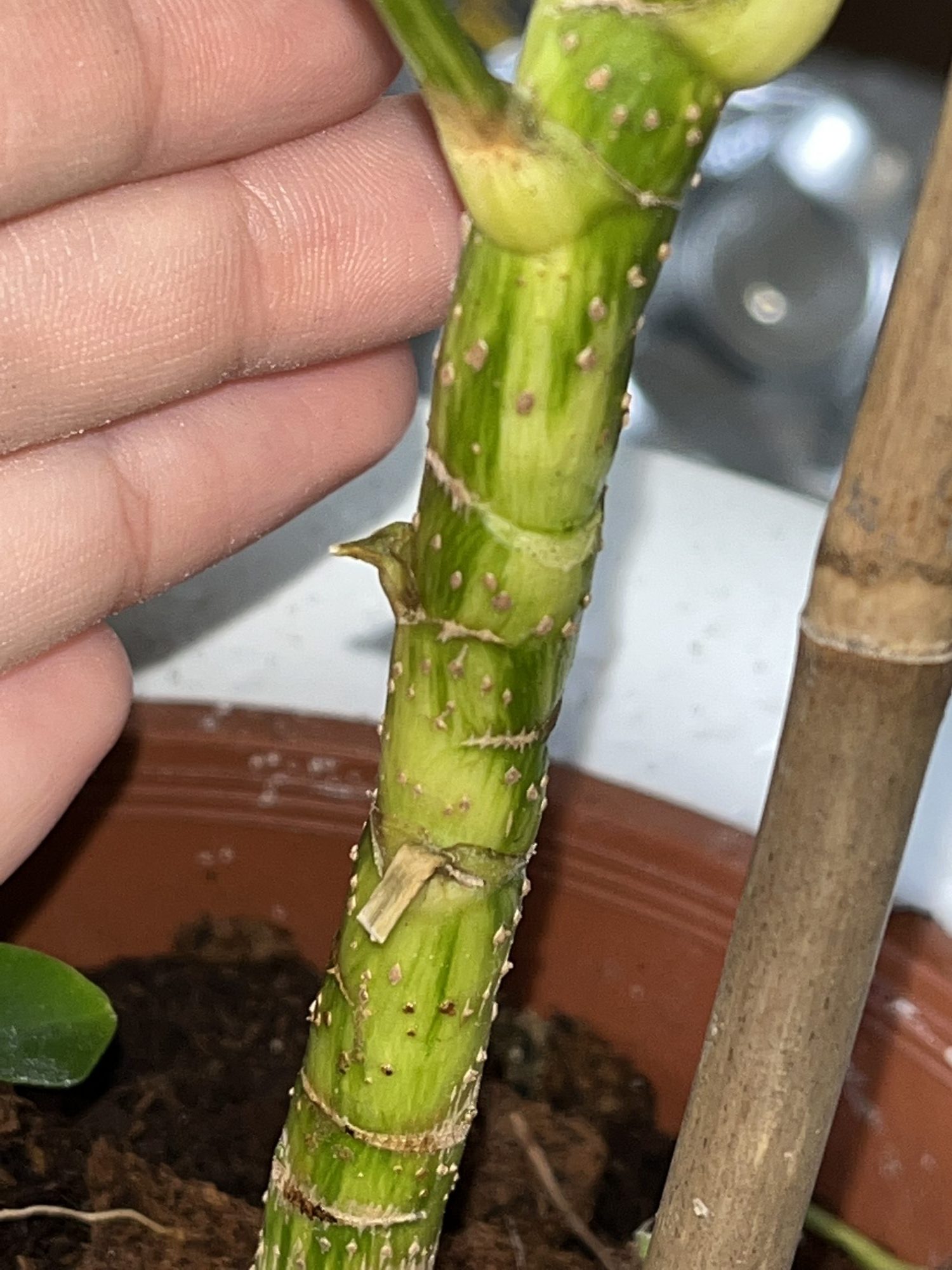 Stamm ist in der Mitte braun, komische Punkte am Stamm und komische Flecken an Blättern