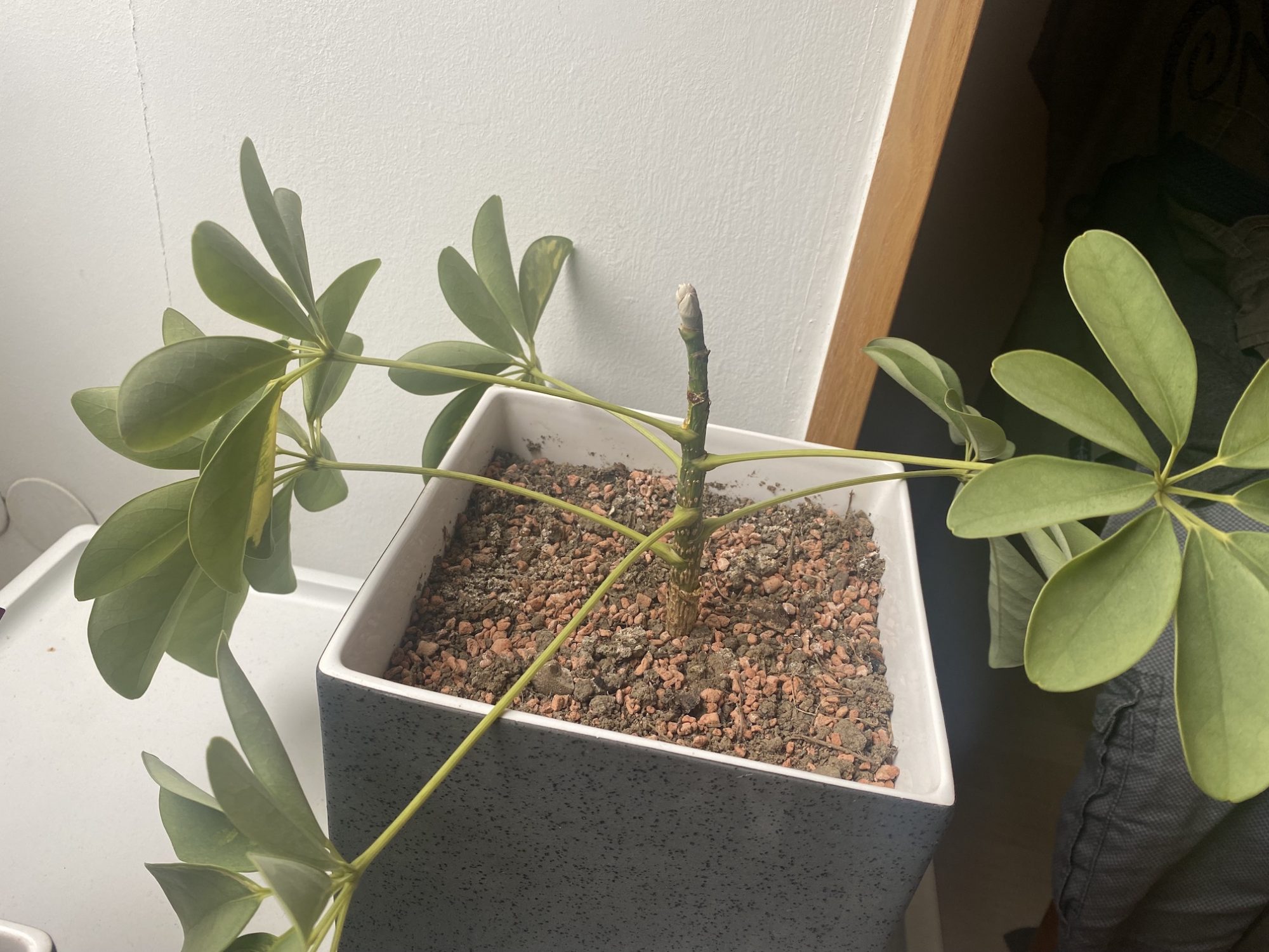 Vielleicht sollt ich den grauen Teil einfach abschneiden – verkraften Scheffleras sowas üblicherweise leicht?