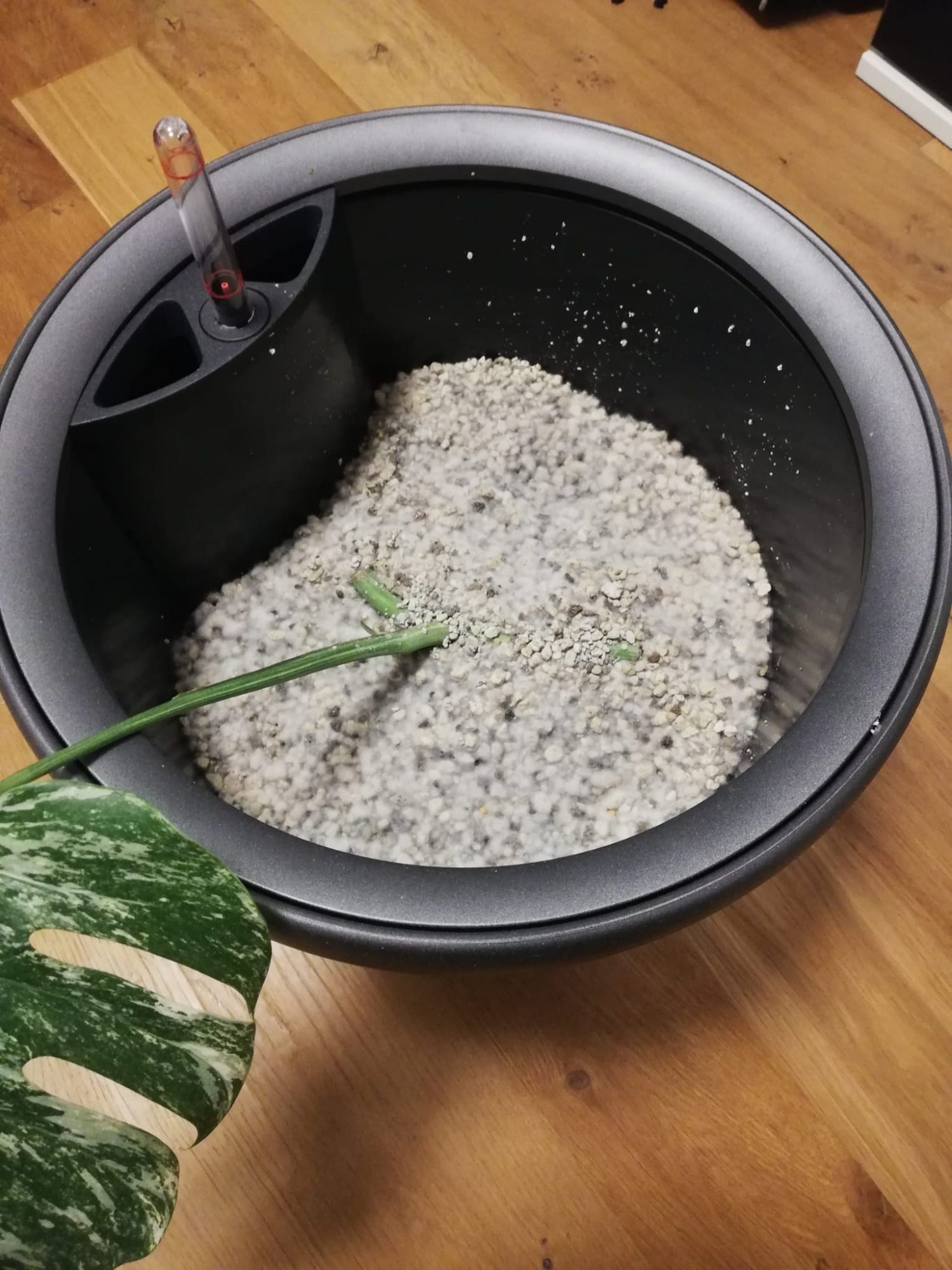 Kurz vorweg. Ich habe die Monstera am Anfang in Wasser hochgezogen bis genug wurzeln da waren. Danach das erste Mal in den Pon eingepflanzt. Den Pon habe ich nach Anweisung aus dem Internet erstmal von oben/drüber gegossen und nicht vom einfüllloch vom Topfsystem.