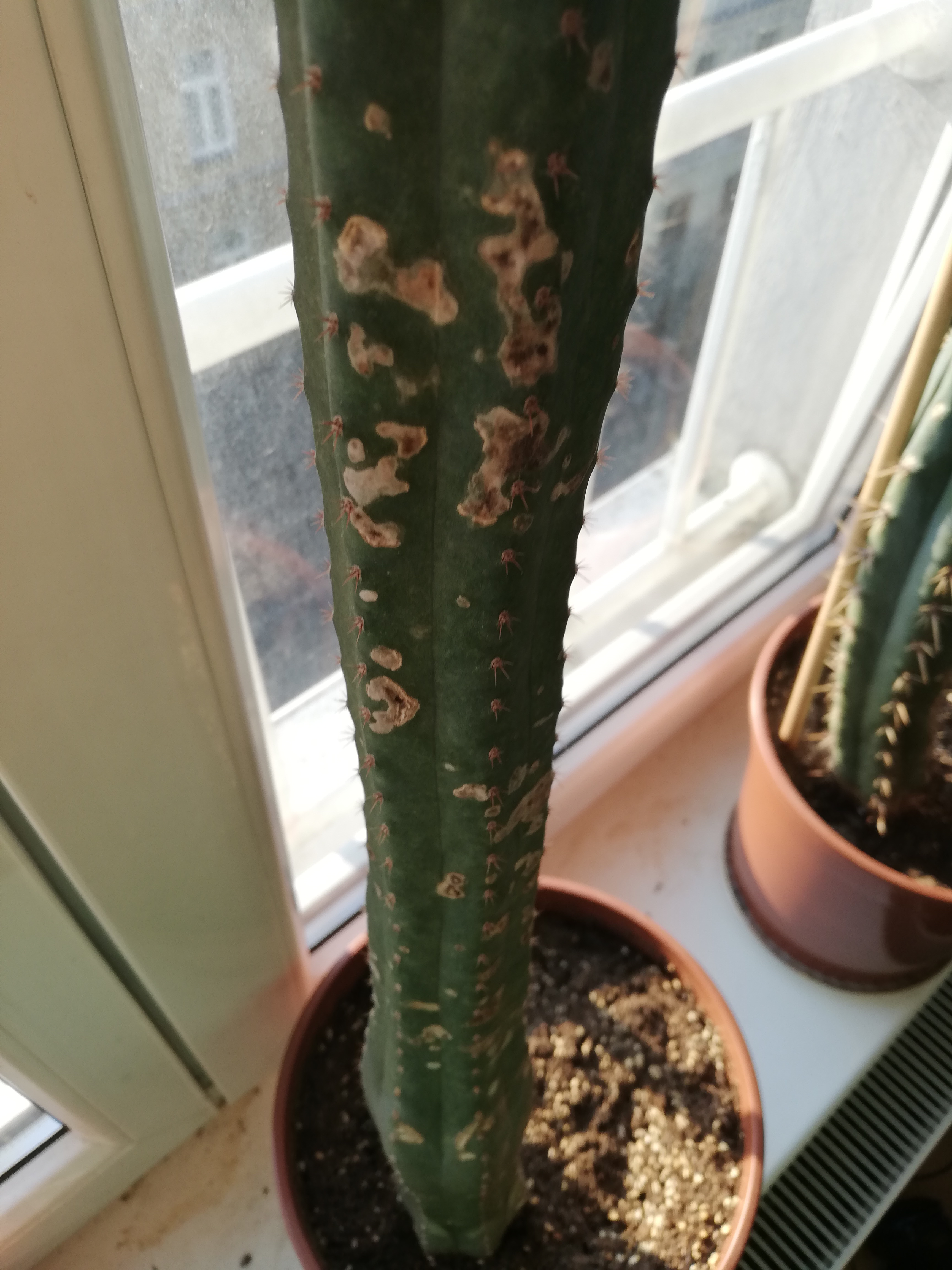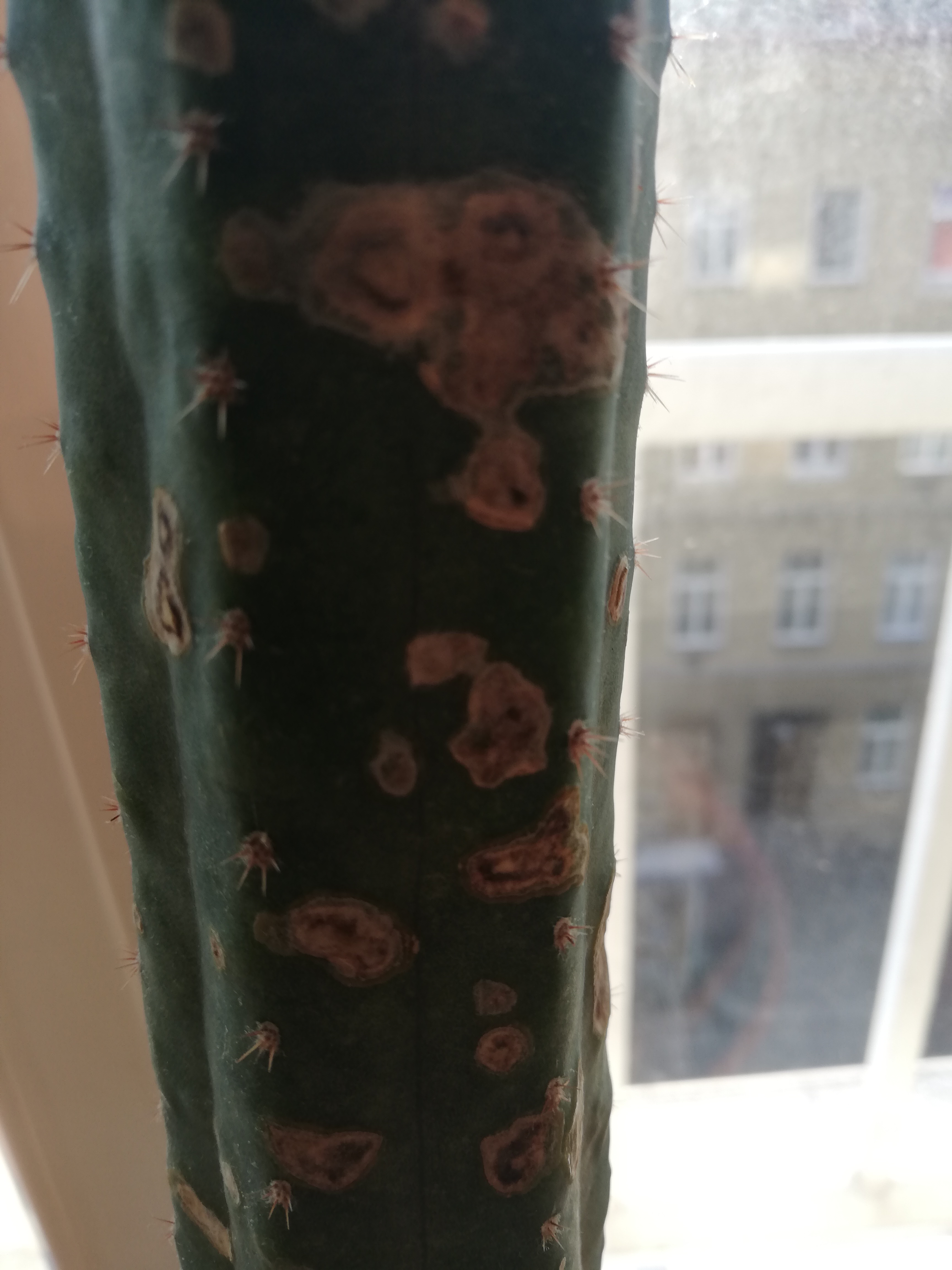 Komisch ist auch, dass es nur den unteren Teil des Kaktus betrifft, oben (also die letzten 3 Jahre ca.) sieht man überhaupt nichts davon...