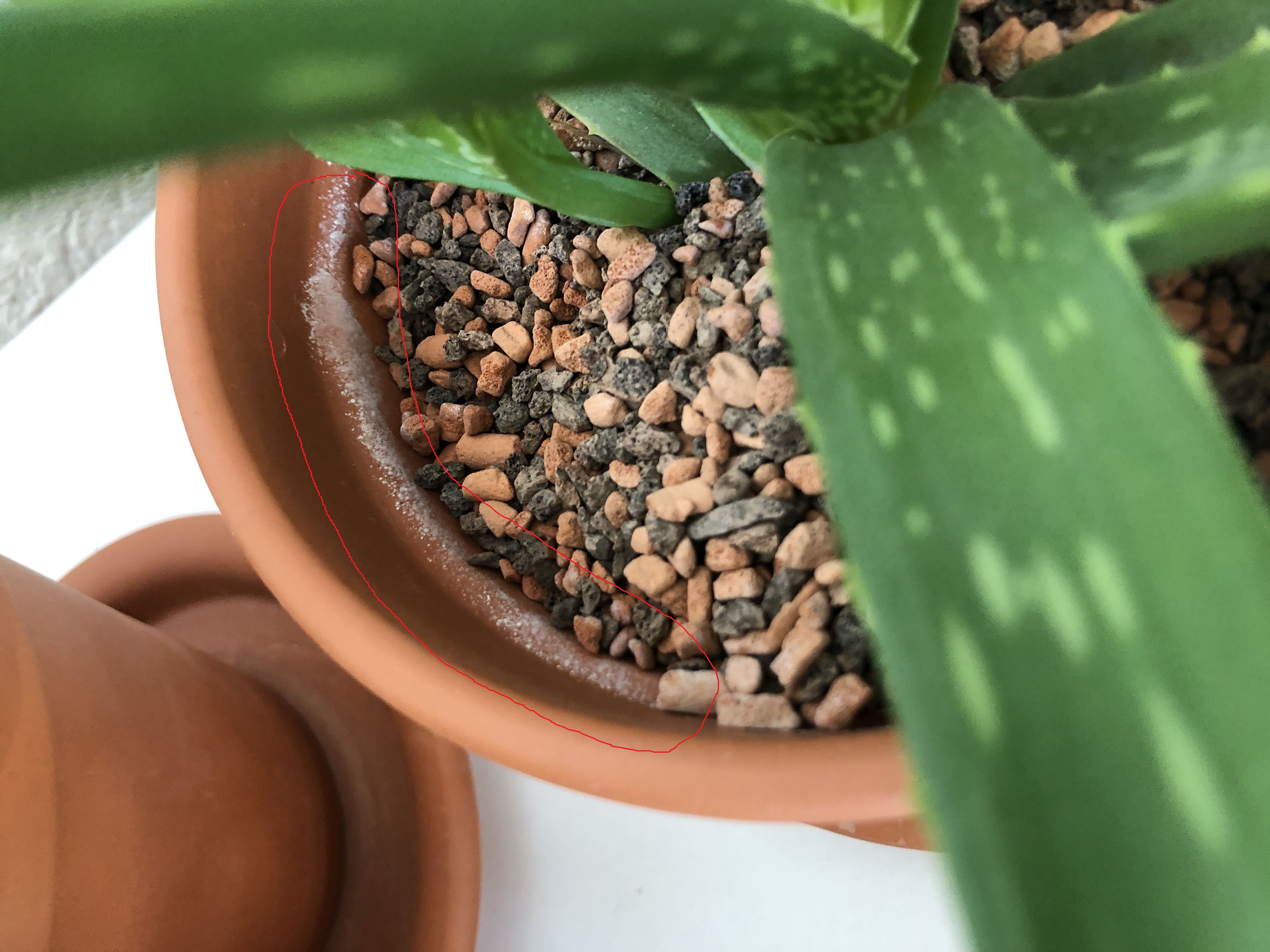 Daraufhin habe ich sie öfter gegossen und auch vom Fenster weggestellt, in eine Ecke. Rückblickend war das Wegstellen vllt. doof. Vor einigen Tagen habe ich dann festgestellt, dass am Tontopf (siehe Anhang) der Ableger sowie teilweise auch bei den Mutterplfanzen eine weißliche Schicht gebildet hat. Erst dachte ich es wäre Kalk (aber das Wasser hier ist sehr weich) oder Salz, aber bei näherem Betrachten kann man feine Härchen erkennen - also Schimmel - am Tontopf!