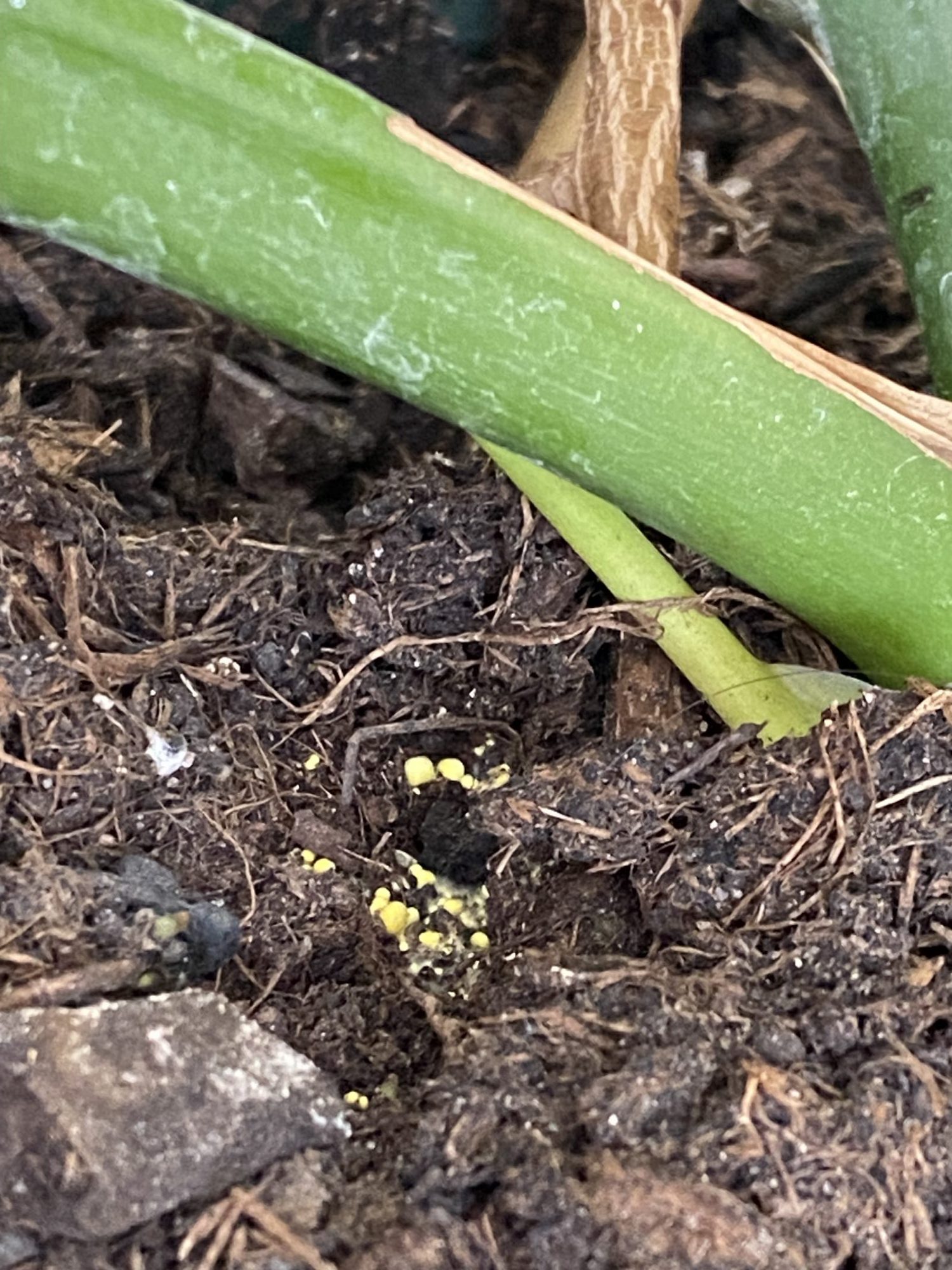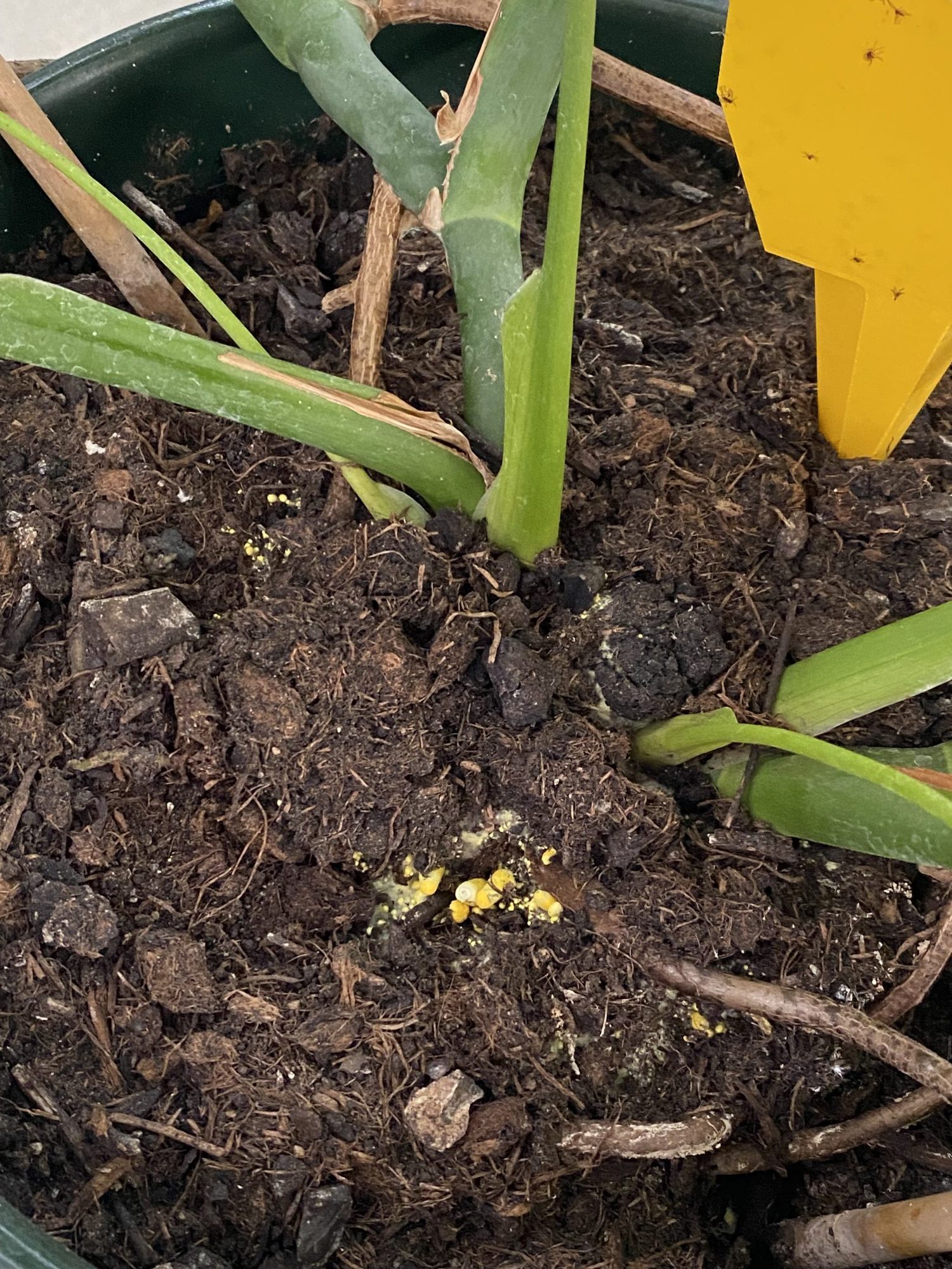Ich habe bemerkt, dass die Erde meiner Monstera teilweise gelbe Punkte aufweist, es sieht auch aus als würde sie schimmeln und ich bin mir nicht sicher, ob sich vielleicht auch Pilze gebildet haben?