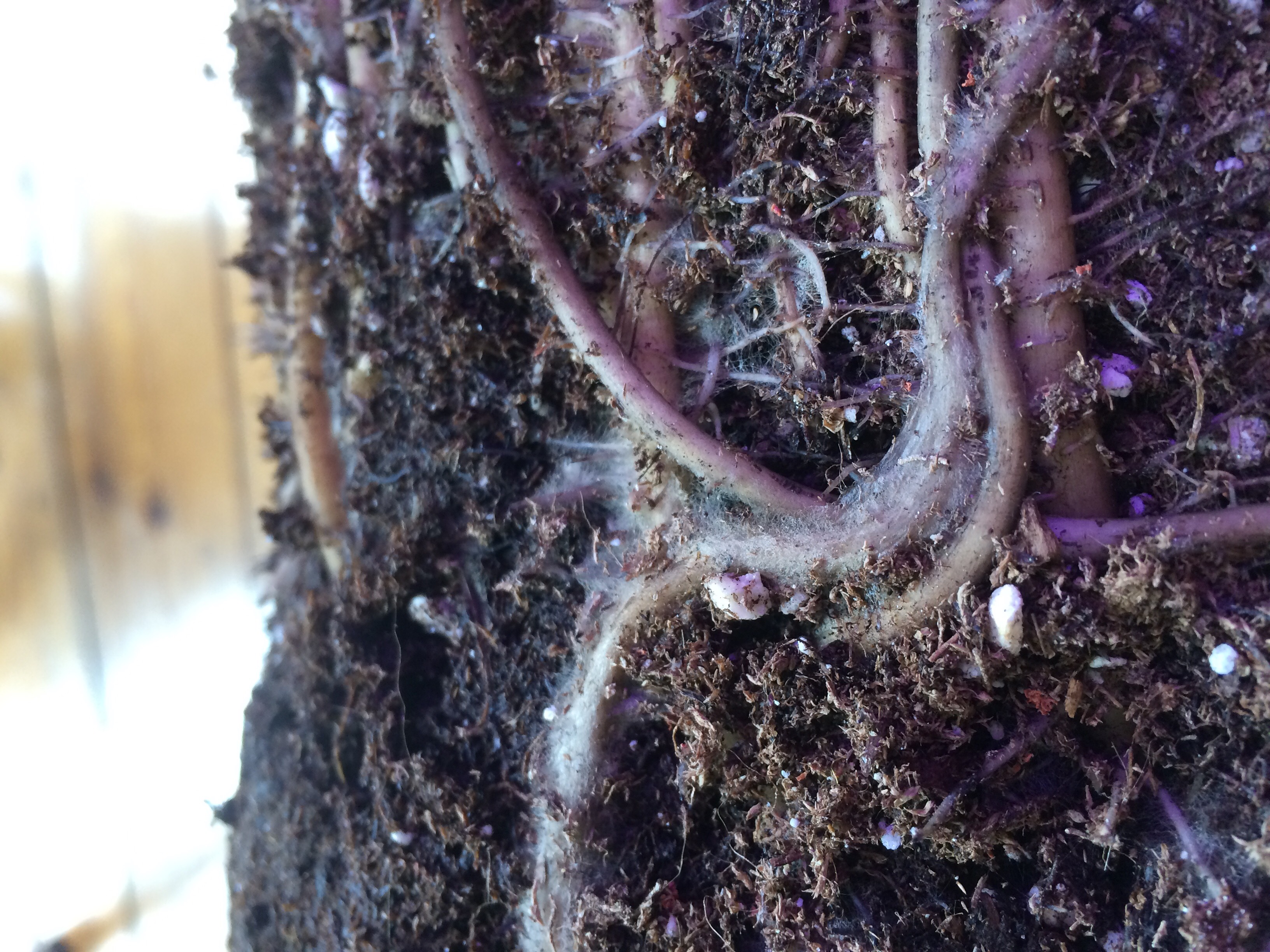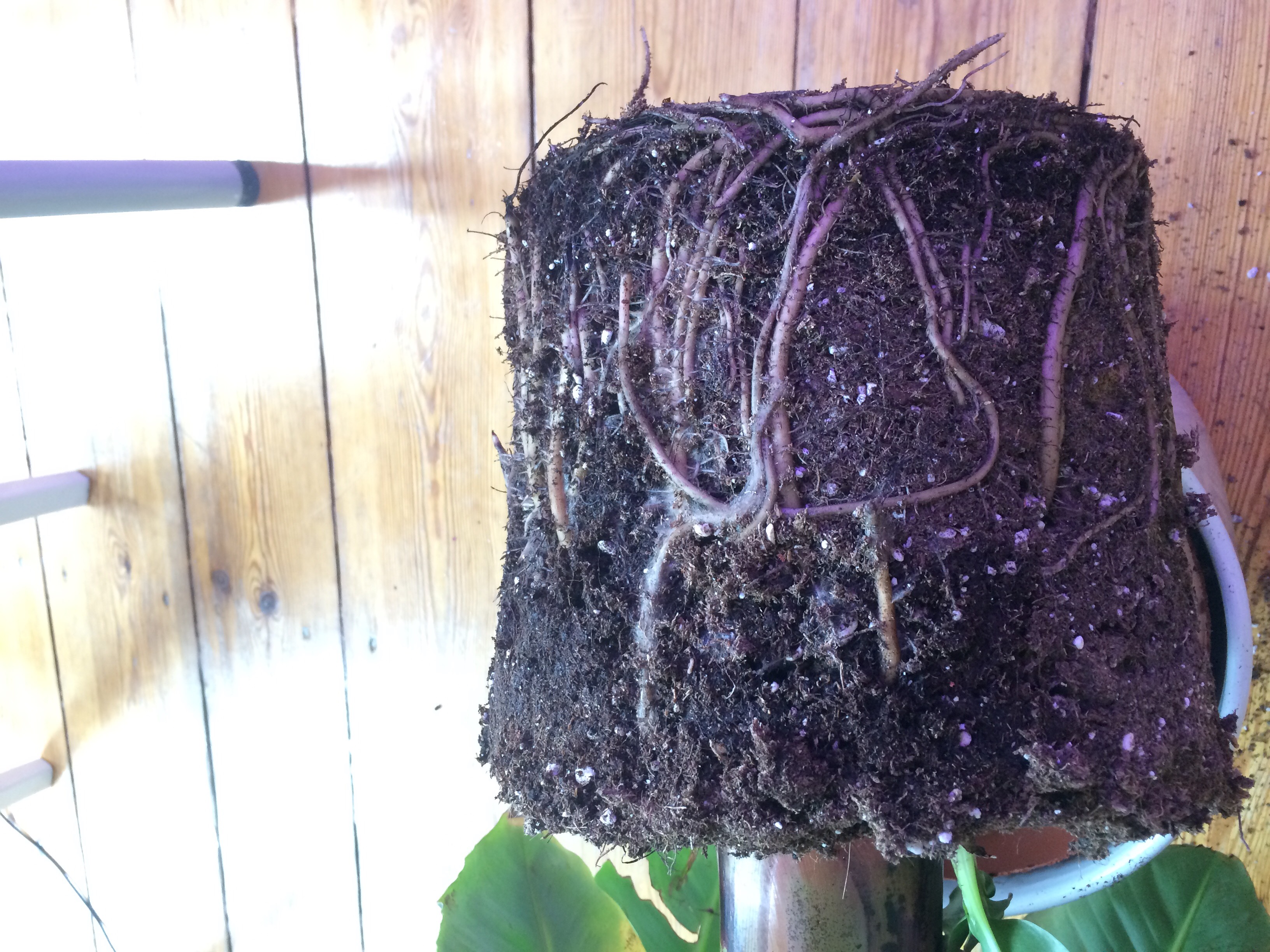 Nun habe ich heute mal geschaut wie es denn eigentlich im Topf aussieht und war mir nicht sicher, ob die Wurzeln schimmeln, oder ob es normal aussieht. Die Erde war feucht und ein kleiner roter Wurm krabbelte durch die Erde.
