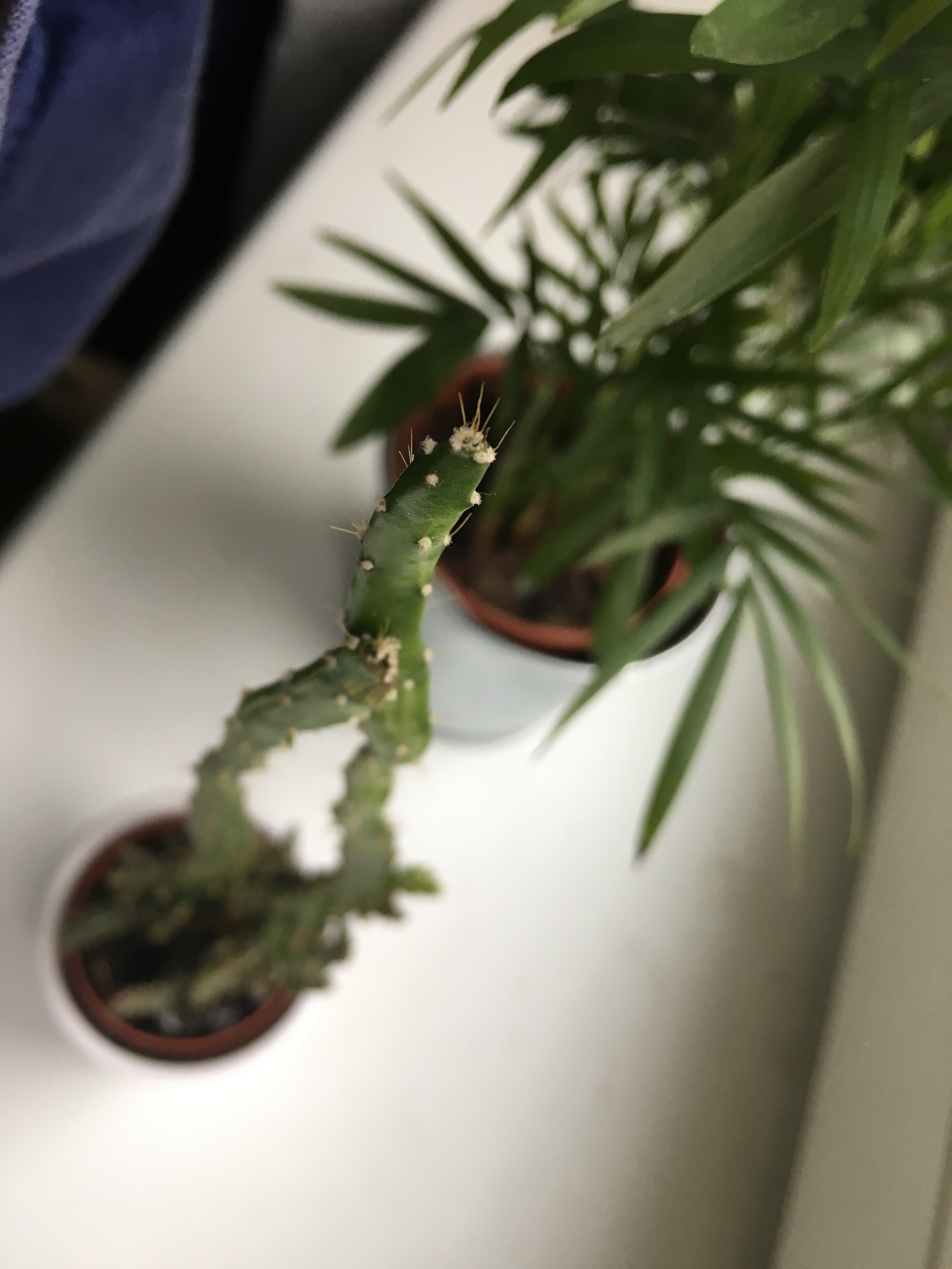 ich habe 2017 zum Umzug einen kleinen Kaktus von IKEA geschenkt bekommen. Er ist mir ziemlich ans Herz gewachsen und hat seit August zudem auch einen ziemlichen Wachstumsschub gemacht. Nun ist mir aufgefallen, dass er rund um die Stacheln weißen Pelz trägt und auch oben an der Spitze etwas Pelz hat. An der kürzeren Spitze ist auch Verfärbung zu sehen, allerdings dachte ich bisher, dass das vom sehr schnellen Wachstum käme, also quasi wie Dehnungsstreifen