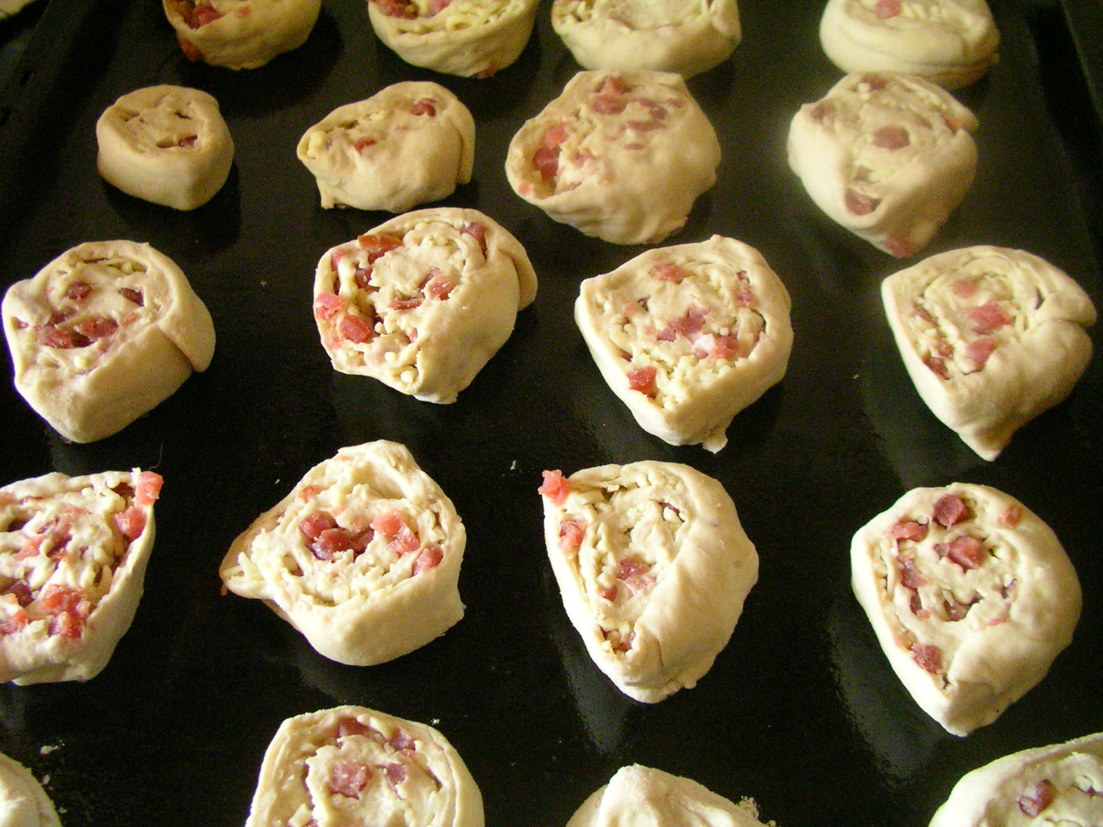 aus diesen Zutaten einen Hefeteig herstellen,zugedeckt ca. 30 Min. aufgehen lassen,Teig aus der Schüsseln nehmen,wenn er klebt,nochmals Mehl unterkneten,den Teig 1/2 cm dick ausrollen,darauf die Schinkenwürfel und die Käsestreifen streuen,das ganze dann aufrollen und das Ende gut verschliessen,in kleine Stücke schneiden,auf´s Backblech legen und nochmals 10 Min, aufgehen lassen, Backofen vorheizen, 150 Grad und 15 min backen