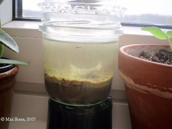 Das Glas/Gefäß stellt man dann einen hellen Platz und deckt es am besten ab, weil sonst das Wasser schnell verdunstet und das Nachfüllen nur alles aufschwemmen würde.