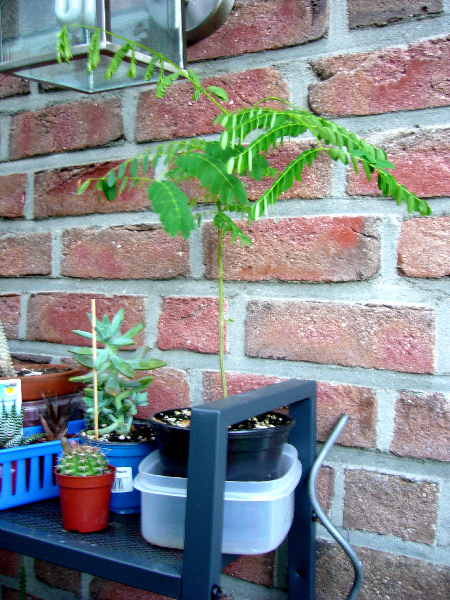 Ich habe viele Beiträge hier im Forum zum Thema Schlafbaum gelesen. Viele von Euch berichten über die gleichen Probleme die ich hatte. Ich habe 2002 Strelitzia-Samen gekauft und als kleines Geschenk gab es eine Tüte Schlafbaum-Samen dazu. Bis dahin kannte ich diese Pflanze nicht. Ich habe mir schnell Anzuchterde besorgt und die Samen reingelegt. Wie Ihr sicherlich wisst, keimt sie sehr schnell und zuverlässig. Die kleinen Pflanzen wuchsen sehr schnell bis sie eines Tages von sich aus einfach aufhörten. Eins nach dem anderen fielen die kleinen Ästchen ab und irgendwann waren sie hin. Ich habe im Laufe der letzten 6 Jahren immer wieder Schlafbaum-Samen besorgt und habe es immer wieder versucht aber leider mit den selben Ergebnissen. Keine der kleinen Pflanzen überlebte länger als 2-3 Wochen. Dieses Jahr sollte alles anders werden Ich habe beim Ausräumen meiner Garage eine alte Packung mit Schlafbaum-Samen die ich Anfang 2007 in Irland gekauft hatte. Da ich nur schlechte Erfahrung hatte, entschloss ich mich alles anders zu machen. Ende letzten Jahres ersteigerte ich eine Heizplatte und einen Biostrahler (für einen Euro!) Ich füllte ein Torftöpfchen mit Zimmerplanzenerde (keine Anzuchterde), legt einen Samen in die feuchte Erde rein und stellte das Töpfchen in mein Mini-Gewächshaus und das Gewächshaus stellte ich auf die Heizplatte unter dem Strahler. Nach etwa 3 Tagen keimte das Samen (trotz der falschen Erde). Ich lies sie dort stehen bis sie zu groß geworden war für's Gewächshaus. Jetzt steht sie auf meiner Terrasse hinter meiner großen Strelitzie-Nicolai die etwas Schatten spendet. Das kleine Schlafbäumchen hört einfach nicht auf zu wachsen und ist viel großer als alle anderen die ich hatte. Sie ist jetzt 15cm groß mit 11 Ästchen. Das oberste Ästchen hat 4 Paar Blätter die je ca. 9cm lang sind. Die Pflanze wird eher trocken gehalten. Sie ist inzwischen ca. 3 Monate alt und wenn sie 3-4 Jahre alt werden sollte, werde ich sie auspflanzen.