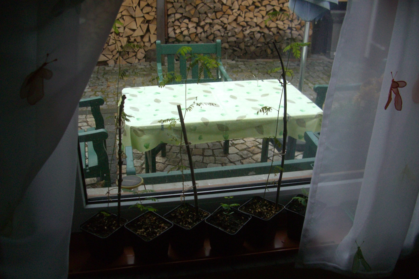 im Fruehjahr hatte ich durch Zufall ein paar Samen der gelben Seidenakazie bekommen, von denen einige wenige auch keimten. Letztlich sind 3 Pflanzen uebrig geblieben, die sich gut entwickelt haben. Bis zum Herbst hatte ich sie draussen, jetzt stehen sie im Kinderzimmer (wenig benutzt - Temperatur daher ca. 18-20 Grad).