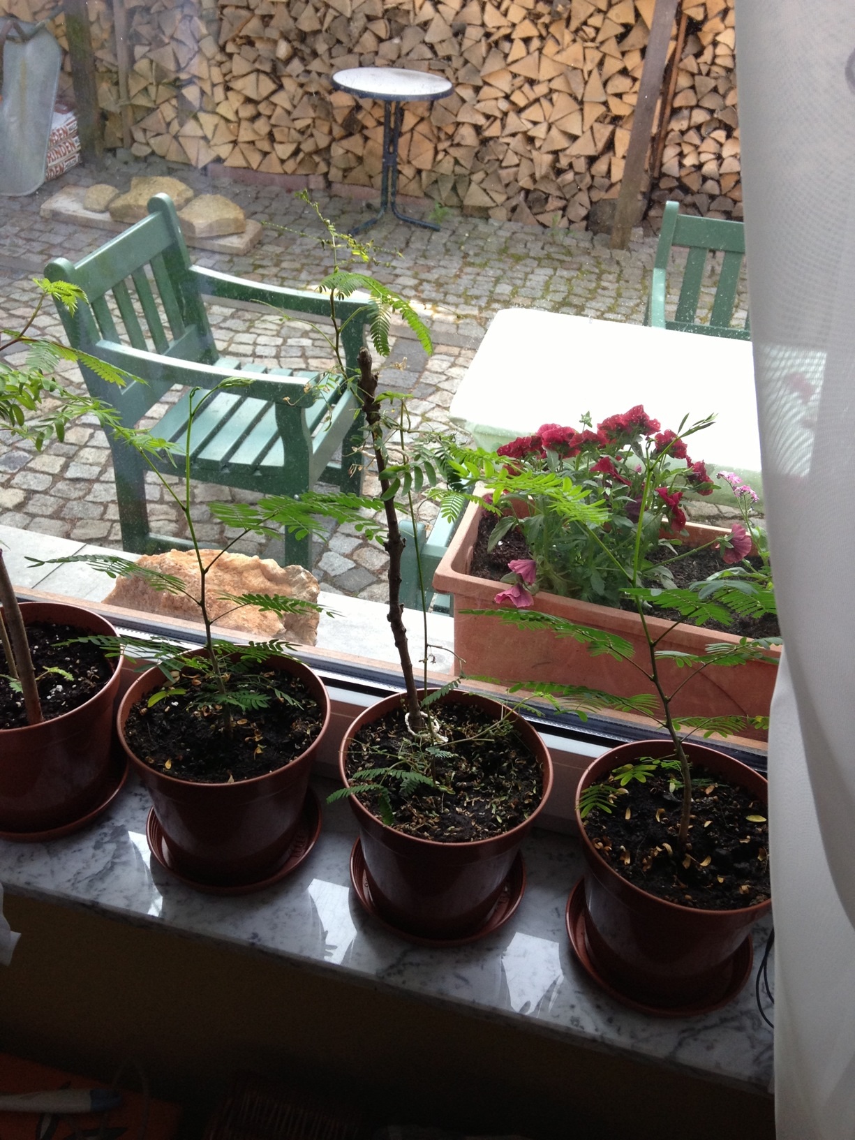 Mittlerweile entwickeln sich die Seidenakazien super. Eine ist schon um die 80 cm groß, eine weitere etwas kleiner. Nur die 3., die ich versuchsweise oben abgeschnitten hatte, mickert etwas, bekommt aber auch laufend neue Blätter.