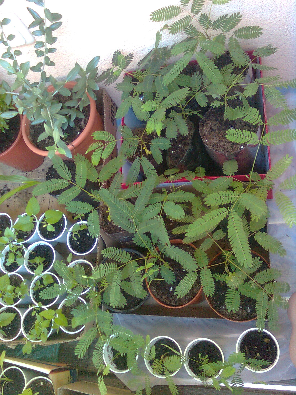 Eine ganz ganz Liebe hier aus dem Forum hat den Kindern vier kleine gelbe Seidenakazien geschenkt. Muttern die gleich eingetopft und fürsorglich in den Schatten des Kumquatbäumchens auf den Balkon gestellt. Dort stehen sie im Topf des Bäumchens, werden vor zu viel Sonne geschützt, bekommen aber Regen ab. Logisch, wenn man einen Blick aus dem Fenster wirft.