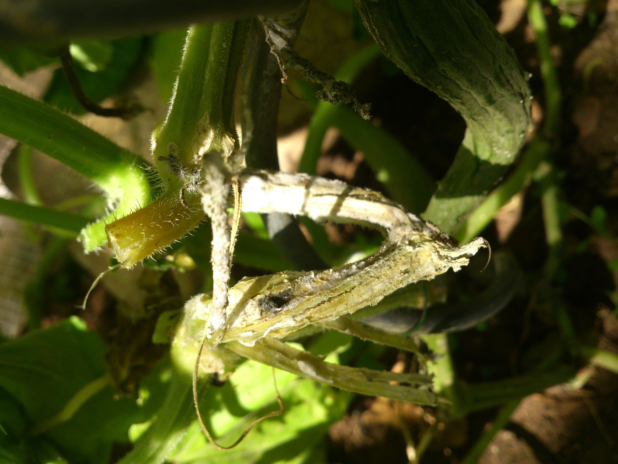 ich brauche dringend Hilfe mit meiner Schlangengurke. Ich habe das Problem das meine Pflanze von einen Tag auf den anderen welk wurde. Als ich dann genauer hin schaute sah ich das an dem Hauptstengel so weißes Zeug war und der Stengel wie ausgesaugt aussah. Ich hab keine Ahnung was das sein soll (siehe Bild)