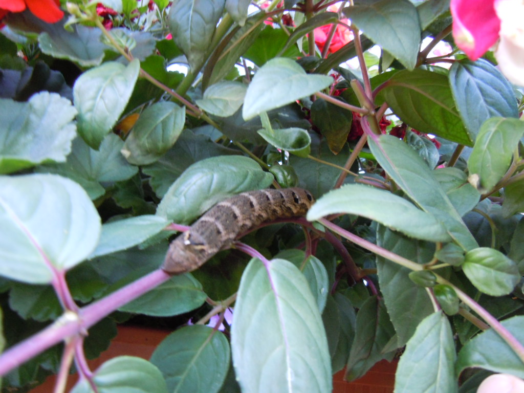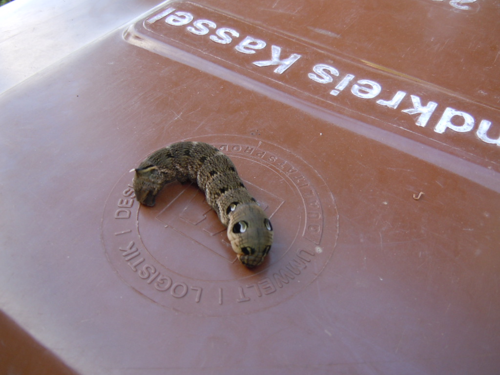 gestern habe ich endlich die fette raupe vom mittleren weinschwärmer gefunden. die köttel hatte ich schon länger gesehen aber die raupe nicht. fühlt sich samtig an und fest, habe sie umgesiedelt in den kompost. mit den "augen"paaren schützt sie sich vor fressfeinden