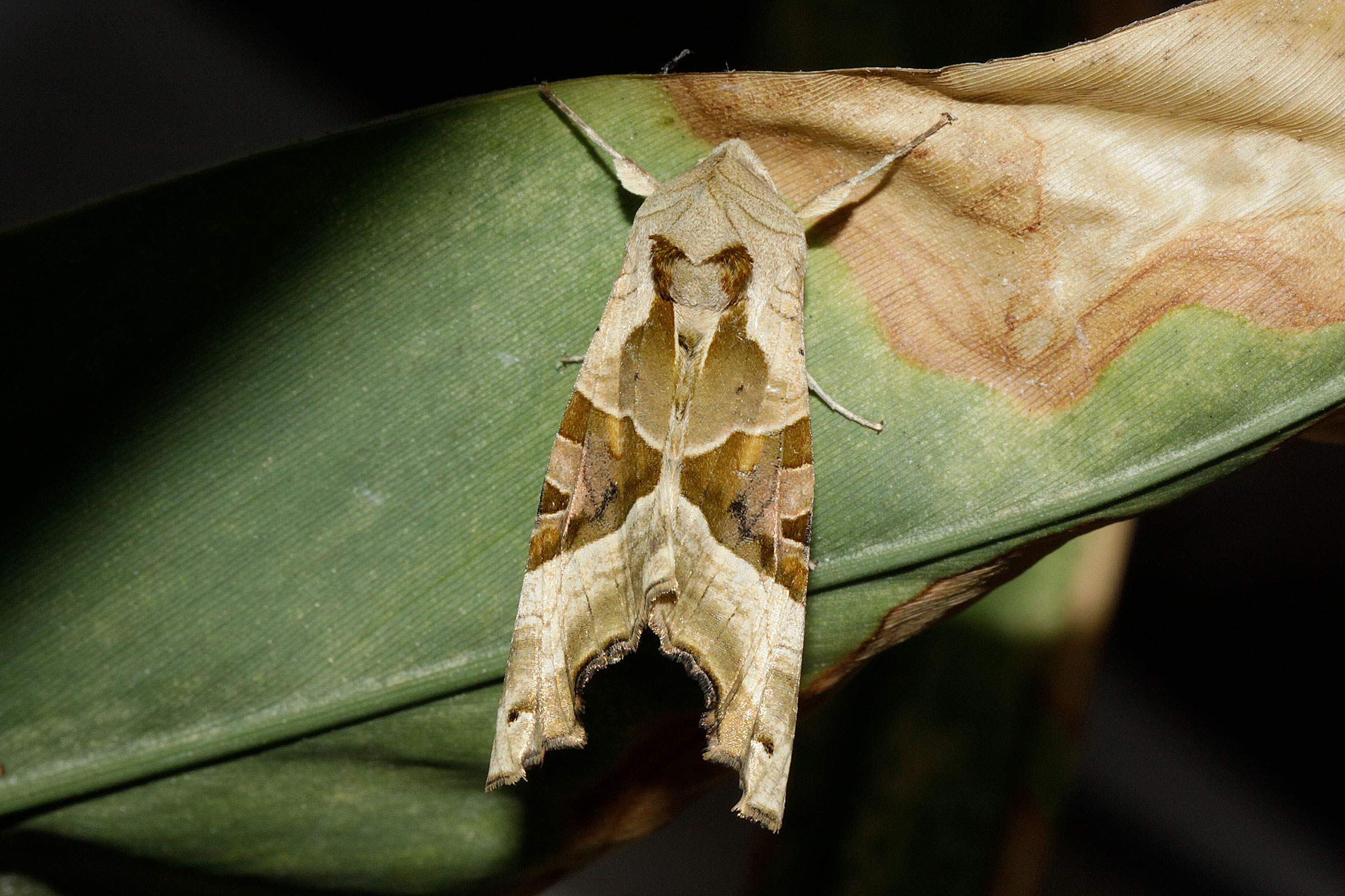 So eine Achateule habe ich auch im Angebot. Am 25. Mai hatte sie sich farblich gut passend auf dem lädierten Blatt eines Galgants niedergelassen. Die feine Zeichnung auf Hinterkopf/Nacken sieht doch fast exakt so aus wie die Ränder des nekrotischen Blattteils!