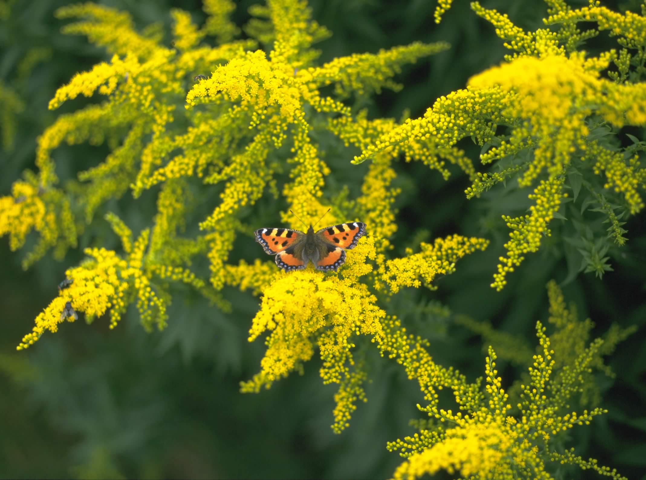 Schmetterlinge sind nicht nur faszinierend zu beobachten, sie sind auch als Bestäuber wichtig. Sie besitzen lange, einrollbare Rüssel und können damit, anders als Bienen oder Hummeln, auch Pflanzen mit tiefen Blütenkelchen bestäuben. Diese kleinen Wunderwerke der Natur lieben warme und windgeschützte Gartenecken. An einem solchen Standort gedeihen neben dem Sommerflieder auch zahlreiche Stauden, die auf Schmetterlinge eine große Anziehungskraft haben: Die Goldrute, botanisch Solidago, zeigt sich im Spätsommer mit leuchtend gelben Blütenrispen von ihrer schönsten Seite. Auch die aus Nordamerika stammende Indianernessel (Monarda) wird gerne von den farbenfrohen Faltern besucht. Diese etwa einen Meter hohe, zumeist rot blühende Staude verströmt einen angenehmen, aromatischen Duft. Ungewöhnlich sind ihre an Quirle erinnernden Blütenstände. Sowohl die Goldrute als auch die Indianernessel lassen sich wunderbar mit Gräsern kombinieren.