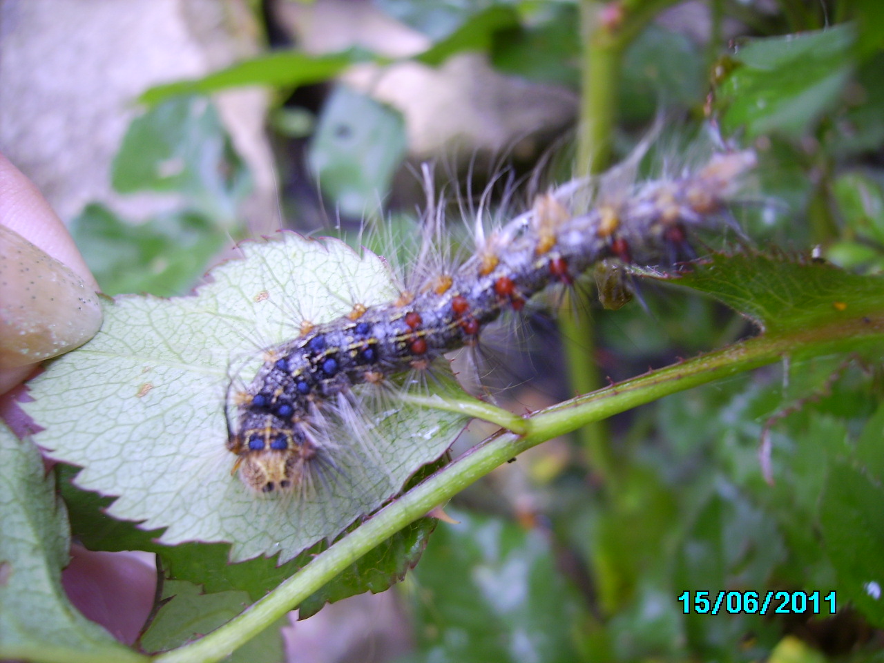 Raupen von Mai bis Juni antreffen kann. Raupe schwarz mit rostroten Rückenflecken.