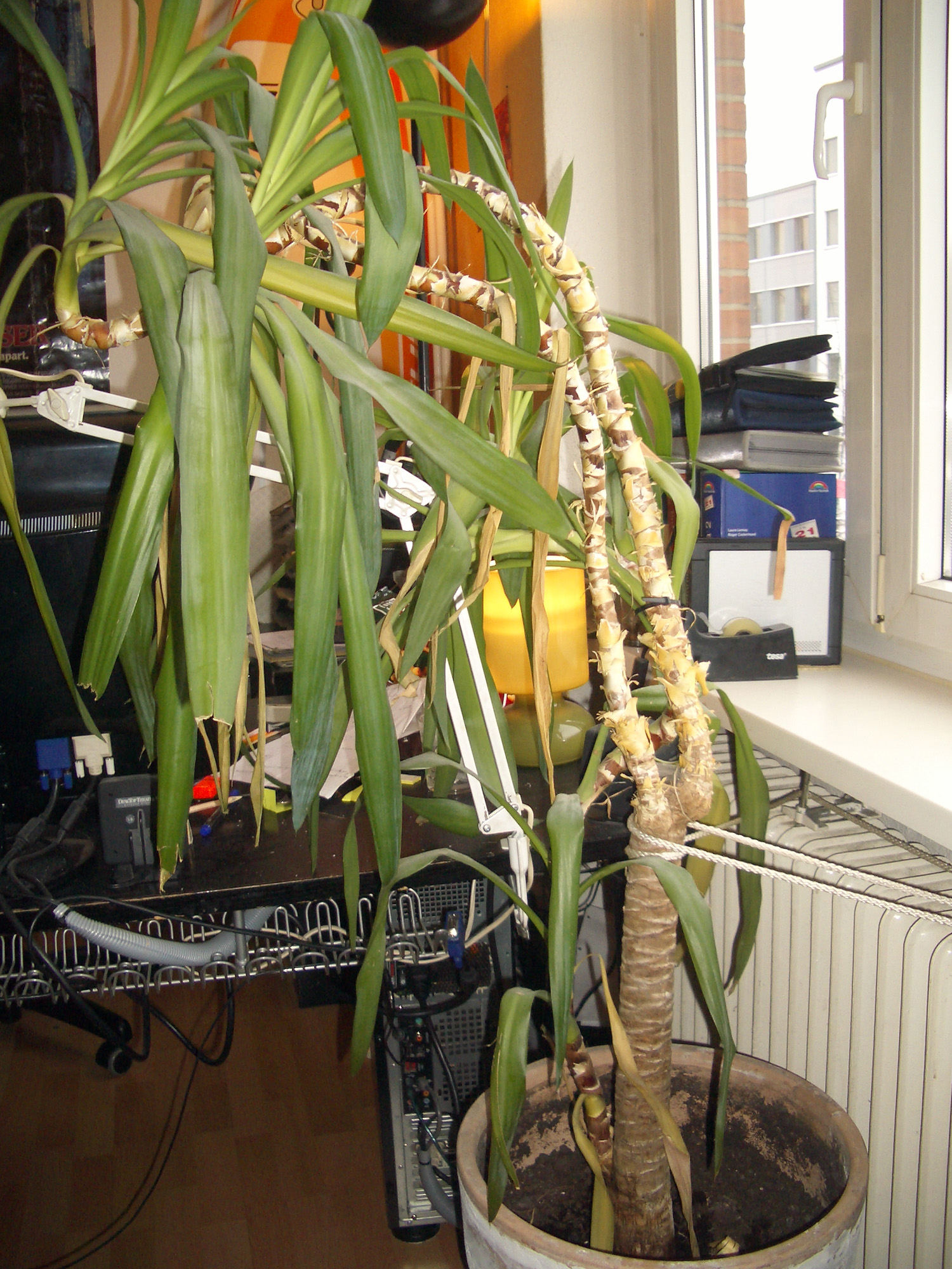 Du hast da eine Yucca, die deswegen so gaggelig aussieht, weil sie immer versucht, Richtung Licht zu wachsen. Wahrscheinlich steht sie auch ein bißchen zu weit von einer natürlichen Lichtquelle entfernt.