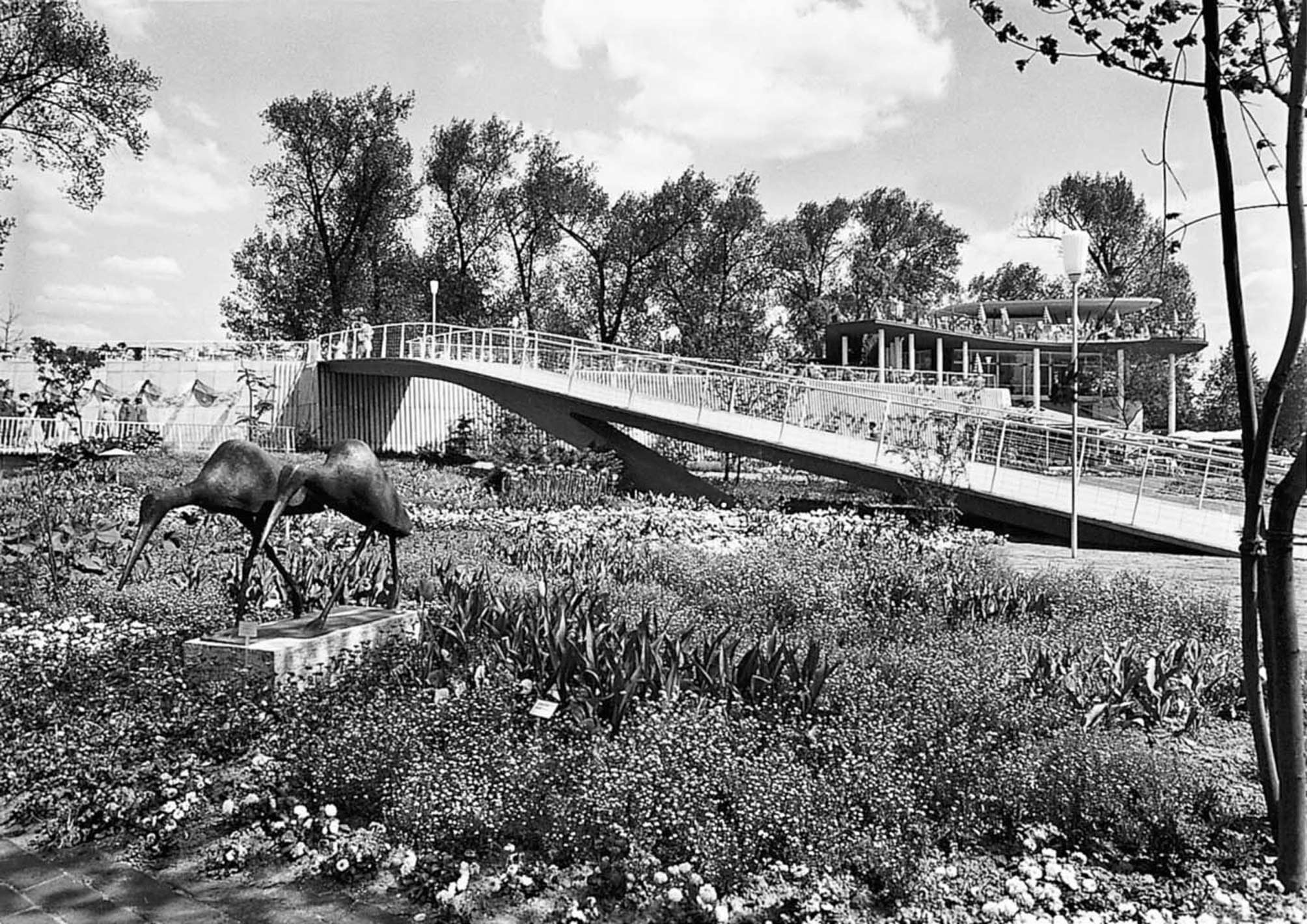 Die Möglichkeit, Oberflächen unterschiedlich zu strukturieren und dem Beton Farbigkeit zu verleihen, begeisterte Planer und Besucher gleichermaßen. Die Gestaltung der Gehwege mit farbigen Betonplatten nahm in dem für die 50er-Jahre typischen Hang zur Asymmetrie schon fast revolutionäre Züge an. Bisher wurden im Garten- und Landschaftsbau ausschließlich Natursteinplatten verwendet, jetzt gab es mit dem Beton vielfältige neue Gestaltungsmöglichkeiten. Außerdem war der Einsatz von Be-ton wirtschaftlich und das Material war kurzfristig verfügbar; Eigenschaften, die im Wirtschaftswunderland Deutschland große Bedeutung hatten. Aus gestalterischer Sicht gefiel das neue Material, weil es den Architekten bei großer Stabilität erlaubte, Bauwerke zu erschaffen, die Leichtigkeit und Eleganz ausstrahlen. Ein Beispiel dafür ist die Rampe, die zur Terrasse des Parkhauses führt.