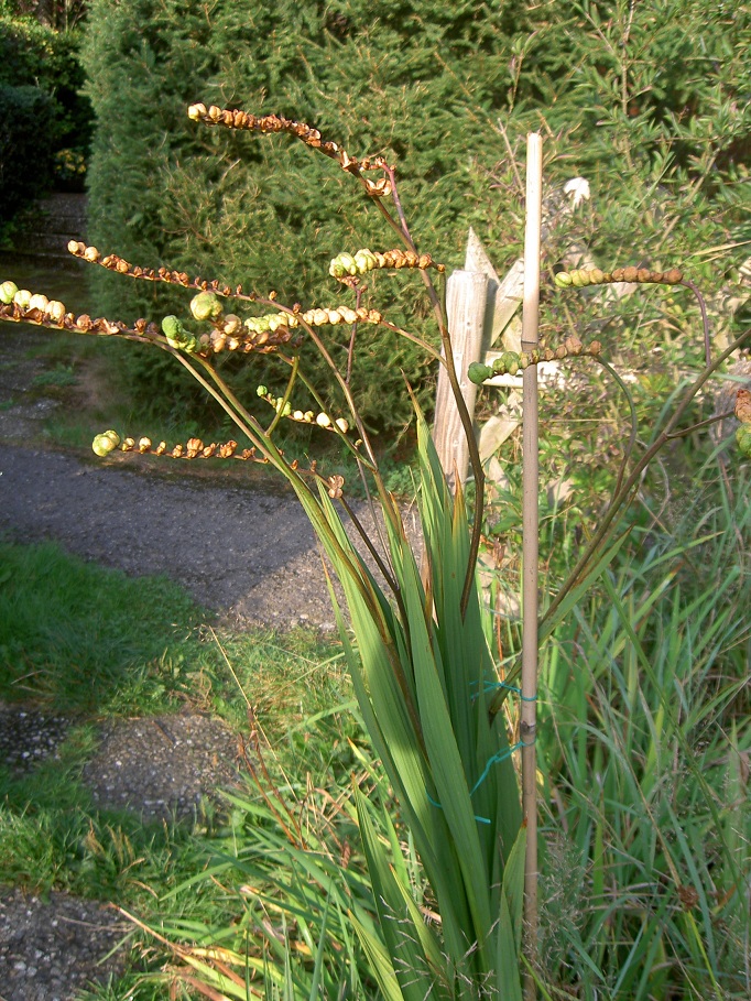 wir haben vor zwei Jahren im Garten an verschiedenen Stellen unter anderem Zwiebeln vergraben. Nun wissen wir nur nicht mehr, welche das (siehe Bild) gewesen sein könnte. Ich vermute, eine Schwertlilie. Leider haben wir nur noch das abgeblühte Foto. Die Blüten waren etwa 2cm groß, rot und gleichmäßig an einer Rispe angeordnet. Kennt jemand zufällig die Art?