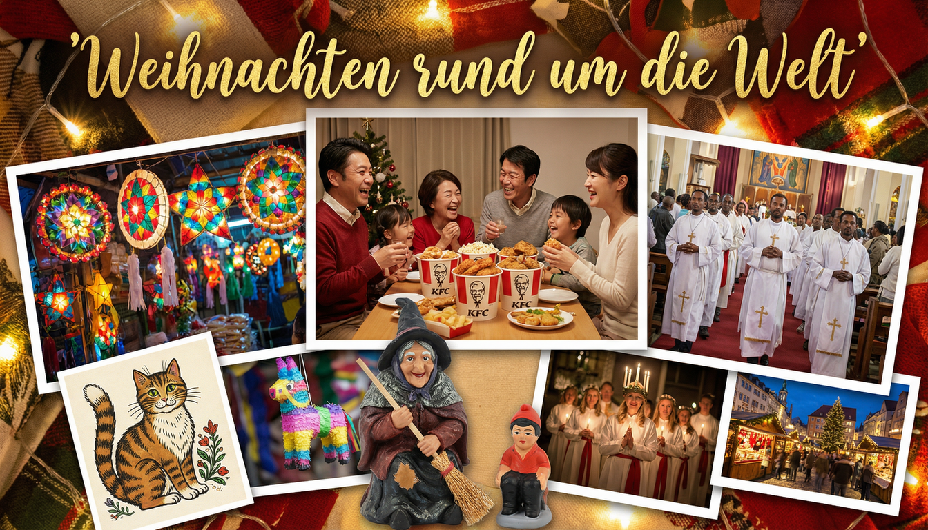 Während bei uns der Duft von Plätzchen und Glühwein in der Luft liegt und der geschmückte Tannenbaum im Wohnzimmer erstrahlt, wird Weihnachten rund um den Globus auf die unterschiedlichste und faszinierendste Weise gefeiert. Von kuriosen Krippenfiguren über kulinarische Überraschungen bis hin zu gruseligen Gestalten – begleiten Sie uns auf eine Reise zu den buntesten Weihnachtsritualen, Traditionen und Trends weltweit.