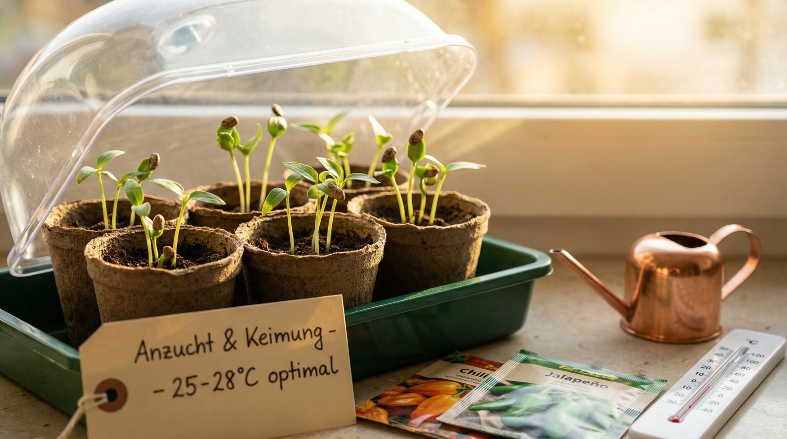 Verwendet hochwertige Anzuchterde und haltet sie gleichmäßig feucht, aber nicht nass. Eine Abdeckung aus Klarsichtfolie oder ein kleines Zimmergewächshaus hilft, die Luftfeuchtigkeit hoch zu halten. Sobald die ersten Keimblätter zu sehen sind, brauchen die Pflänzchen viel Licht und etwas kühlere Temperaturen, um kompakt zu wachsen.