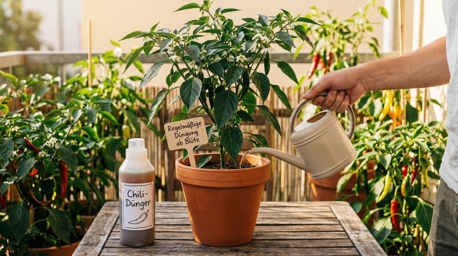 Wenn die ersten Blüten erscheinen, wissen Sie, dass Sie alles richtig gemacht haben. Jetzt ist der Zeitpunkt gekommen, an dem Kalium besonders wichtig wird. Kalium fördert die Blütenbildung und die Fruchtentwicklung. Es sorgt auch dafür, dass die Früchte ihr volles Aroma und ihre Schärfe entwickeln. Wenn Sie bemerken, dass viele Blüten abfallen, ohne Früchte zu bilden, kann das an zu wenig Kalium, zu niedrigen Temperaturen oder unzureichender Bestäubung liegen. Bei Topfpflanzen auf dem Balkon können Sie die Bestäubung mit einem weichen Pinsel unterstützen, indem Sie die Blüten vorsichtig abtupfen.