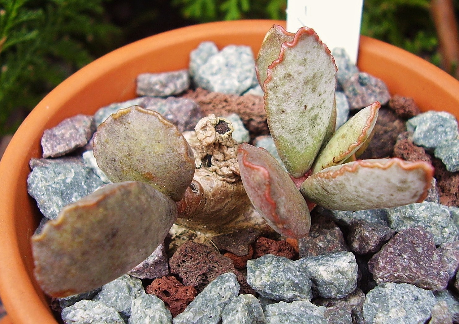 Adromischus schuldtianus halte. Sie hat sich erholt, seit ich sie in einen kleineren Topf gepflanzt habe. Insgesamt mögen Adromischus aber meine Kultur nicht so. Als Pflanzen aus der Übergangszone von Winter- zu Regengebiet in Südafrika sind ihnen unsere Sommer im Freien zu feucht.