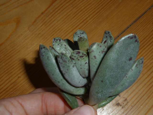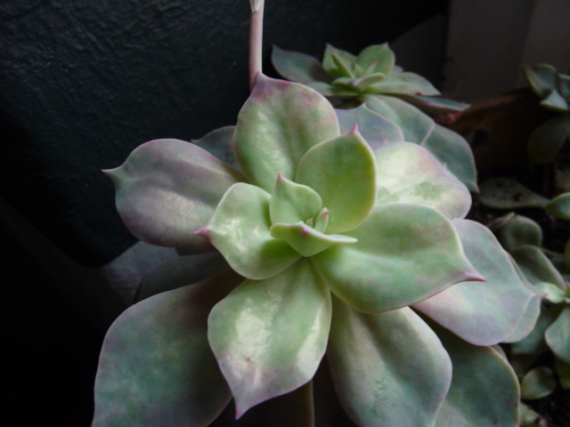 Eine Pflanze bei der mir damals die Etiketten durcheinander geraten sind, ist diese Echeveria. Sie hat noch den Namen E. viridissima, hat sich aber als Echeveria skinneri herausgestellt. Eine von den großblütigen, strauchigen Echeverien aus Oaxaca. Die Arten aus dieser Gruppe gehen sehr stark ineinander über und man könnte auch alle evtl. als eine Art mit vielen Unterarten zusammenfassen. Da ich aber kein Botaniker bin, lasse ich es lieber....