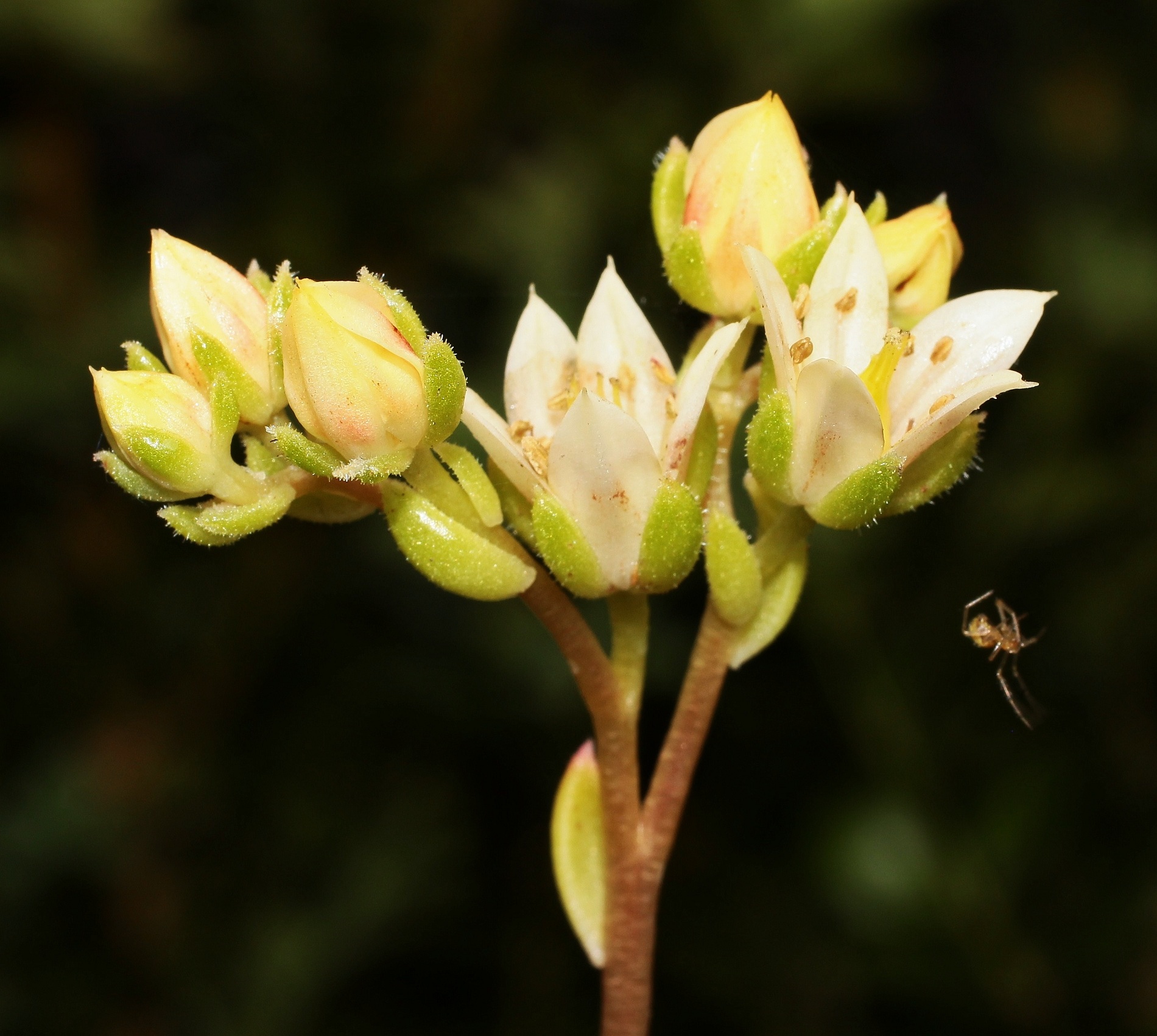 Crassula atropurpurea var. anomala ist eine sehr variable Art. Die Blüten zeigen erst bei sehr naher Betrachtung ihren Aufbau.