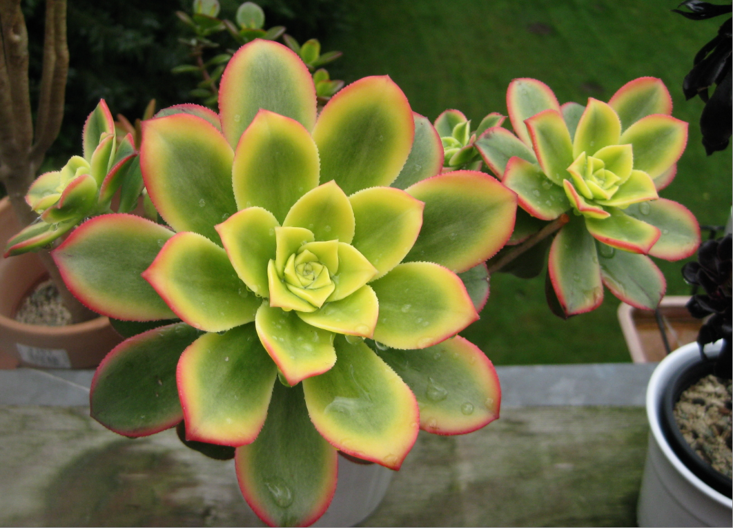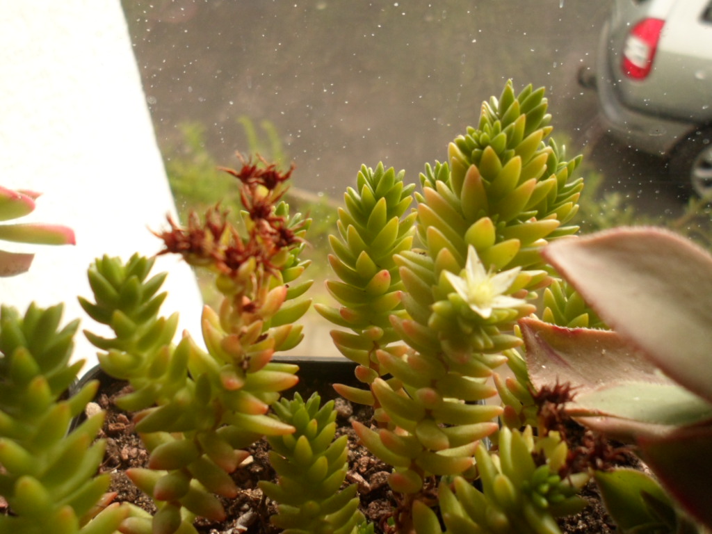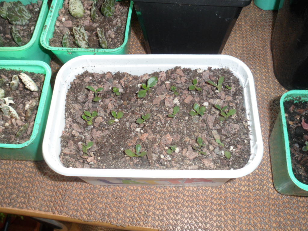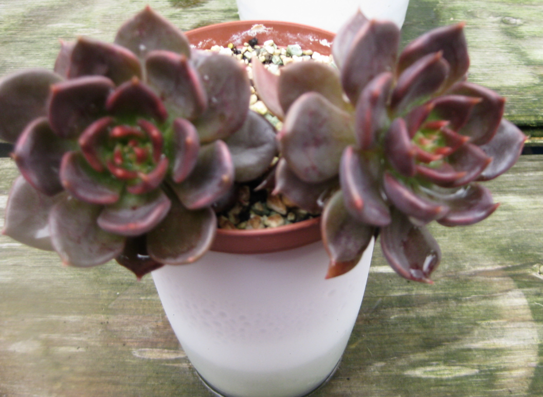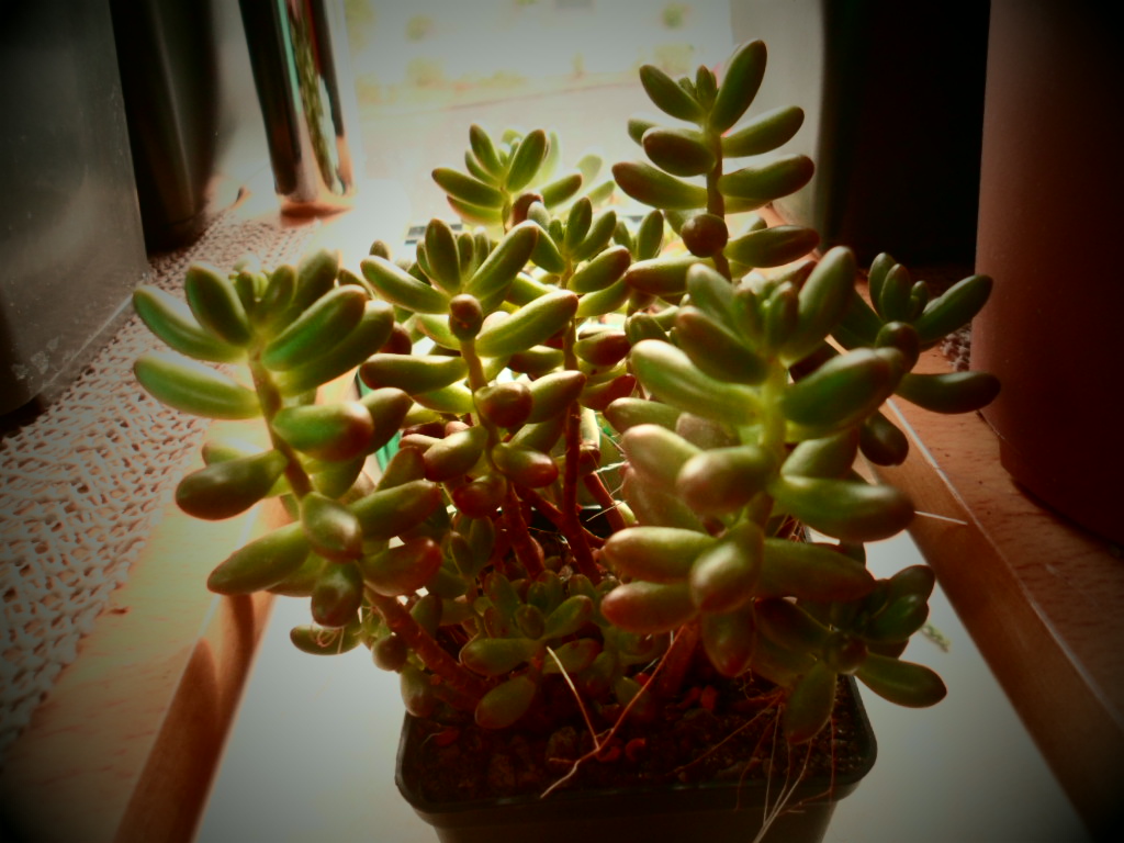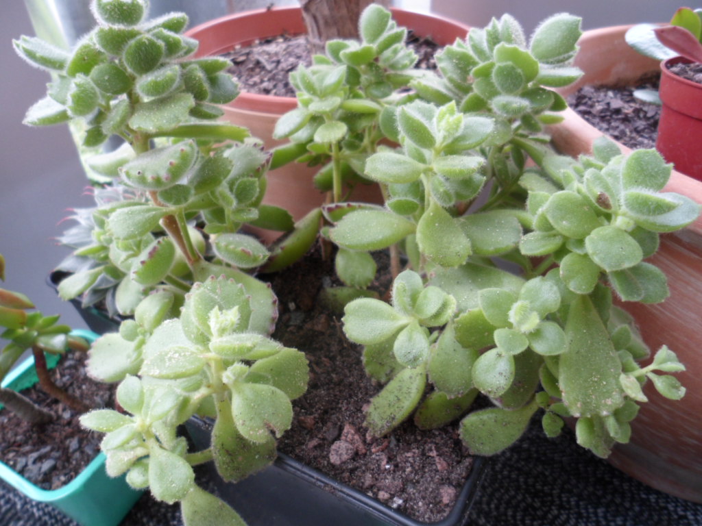 ich weiß nicht genau, ob das hier (zweites Bild) auch so eine Aeonium decorum ist. Sie hat zwei schon etwas dickere, verholzte Stämmchen und einige Rosetten gebildet. Derzeit sind die oben neu nachgewachsenen Blätter noch ohne rötliche Randfärbung, da die Sonne in der letzten Zeit fehlte. Aber ansonsten wächst sich recht flott.
