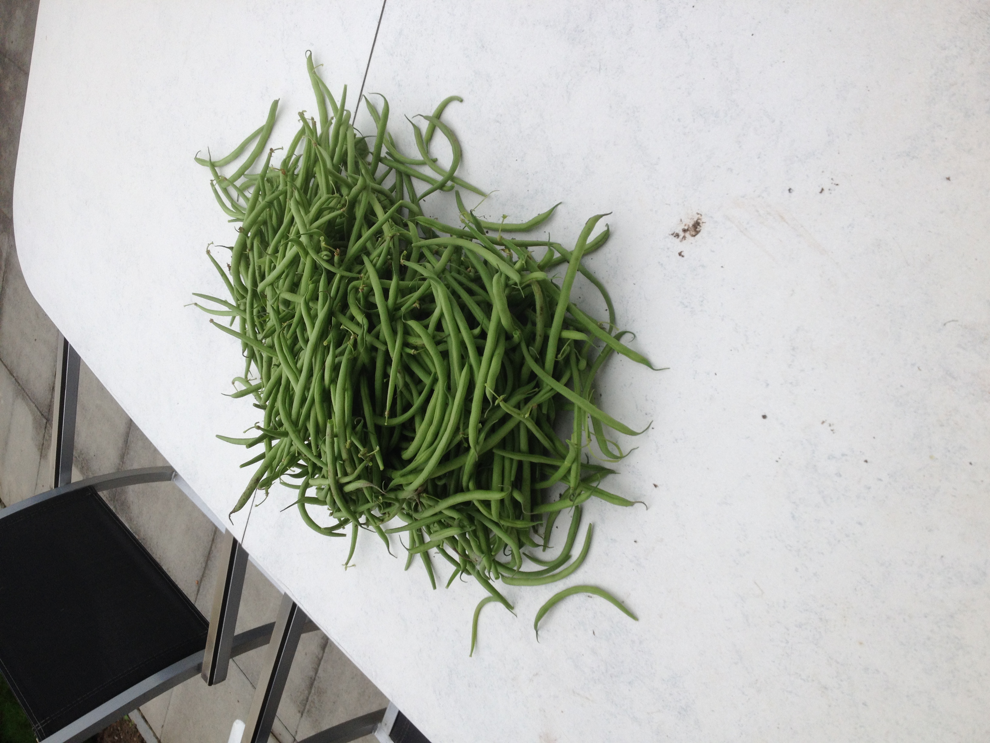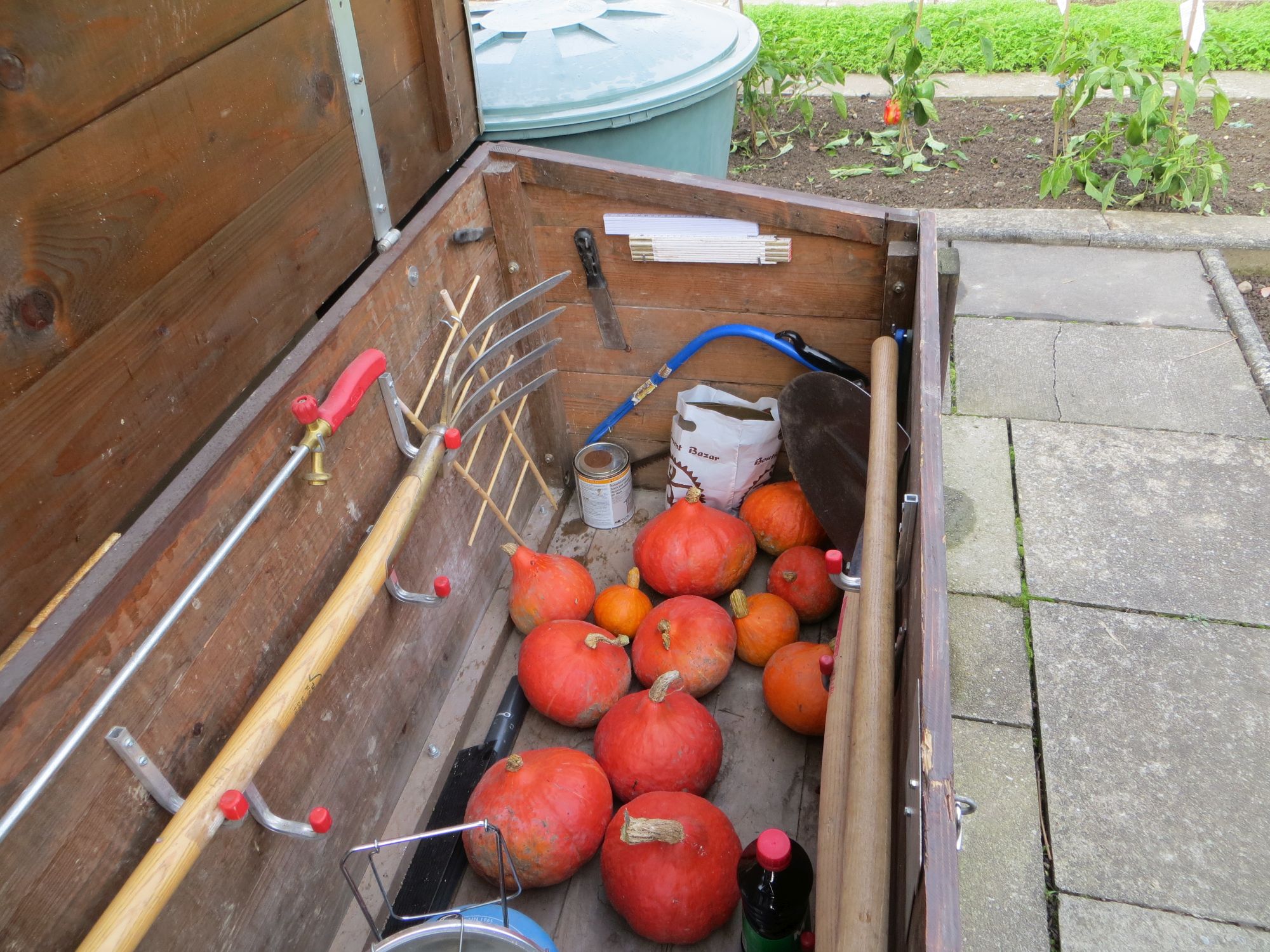 Die letzte Ernte der Buschbohnen und das Zwischenlager für die Kürbisse (oranger Knirps)