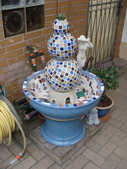 Aus den Materialien Tonkugel weil keine große Styroporkugel auf findbar war, 2 Styroporkugeln in 2 Größen Fliesenkleber und größere Mosaiksteine .