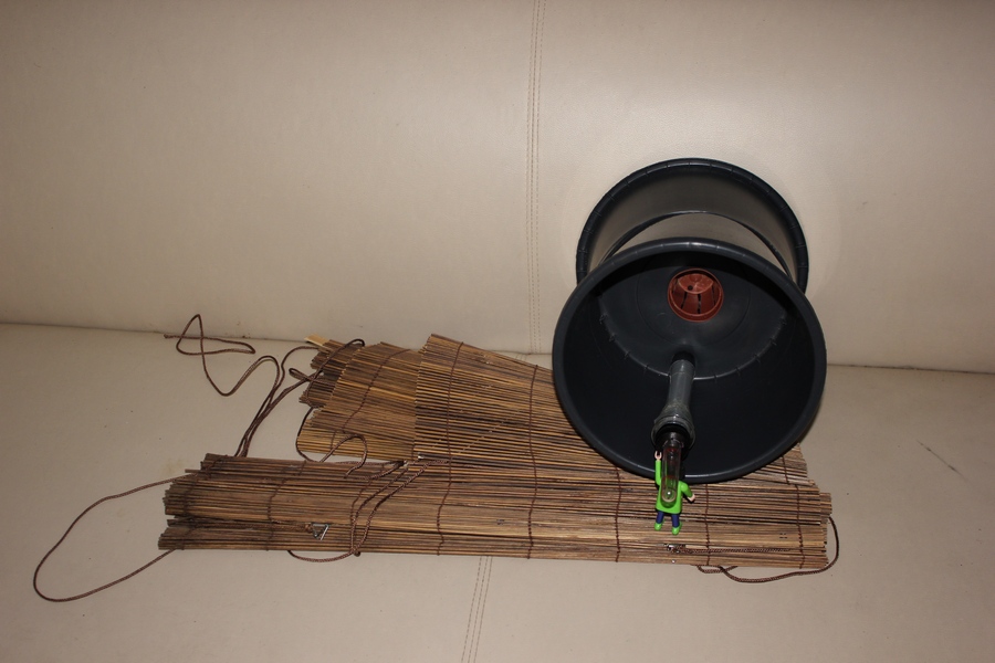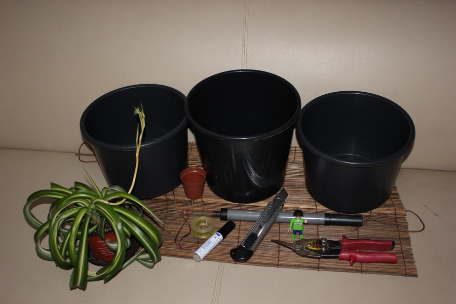Bild 1: man sieht es nicht so gut, aber einer der drei großen Töpfe muß höher sein.Je grösser der Höhenunterschied, desto grösser der Wassertank.