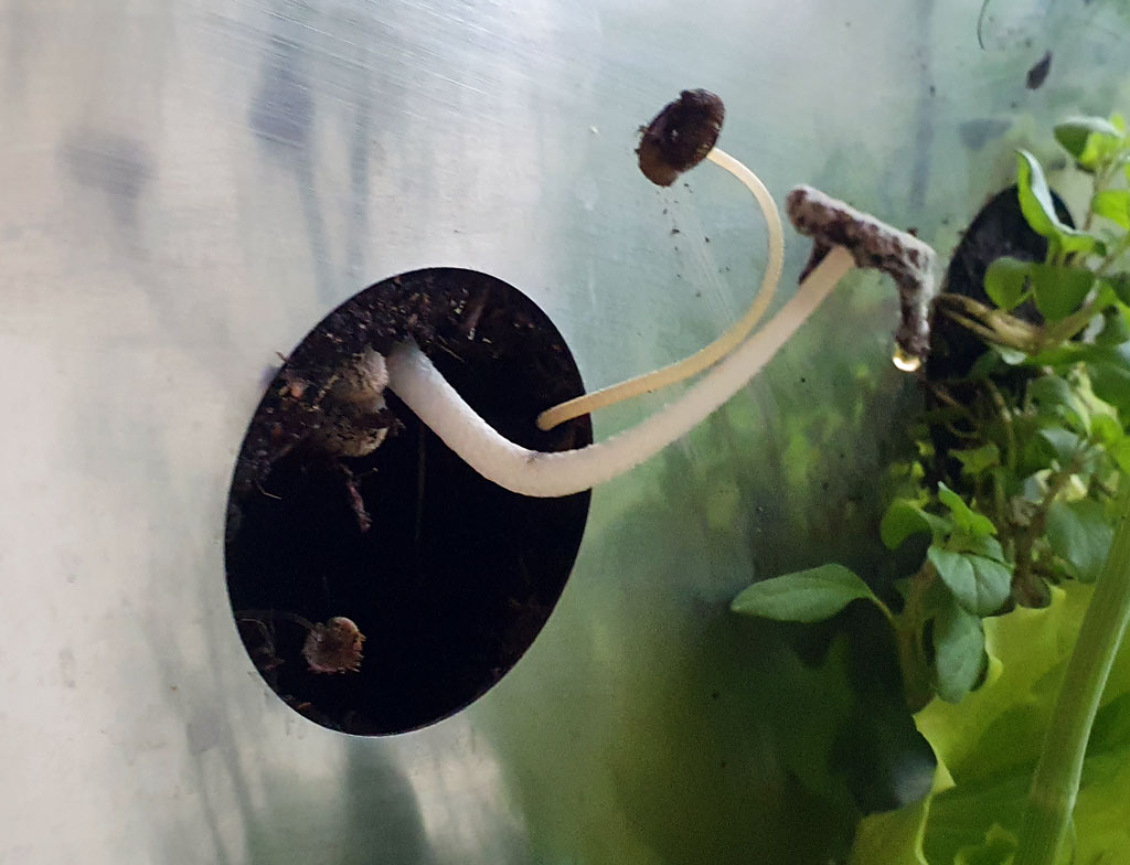 Die Pilze wachsen schnell, sterben rasch ab und die Hinterlassenschaften bleiben an den Edelstahlwänden kleben.