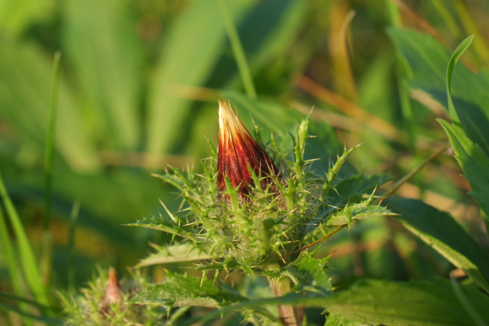 dann fällt mir als nächstes Edelmetall das Gold ein...Also Golddistel (Platindistel oder Palladiumdistel kommt mir blöd vor...) Hat aber auch keine roten Blüten.