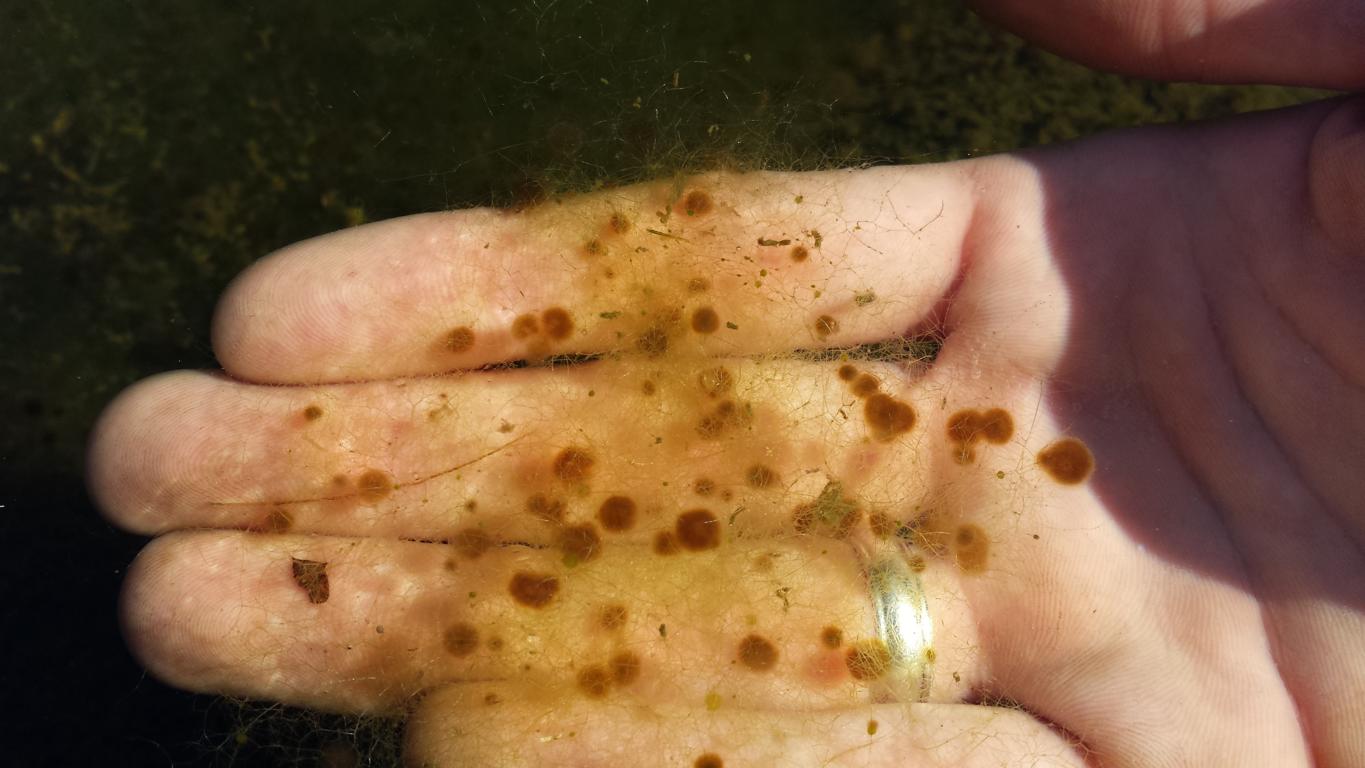 Es sind abertausende kleine runde bräunliche Gallertbällchen. Sie liegen in der Flachwasserzone am Grund. Es sind ganze Uferbereiche übersät davon. Eins habe ich zerdrückt, aber die platzen nicht auf.