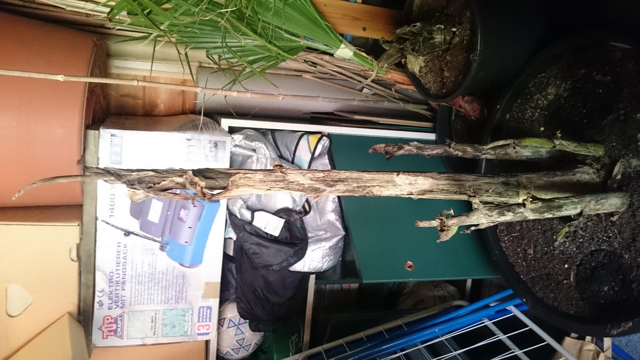 ich habe im Gartenhaus (Thermostat+Heizlüfter min. 3,5°C) meine Palmen, Kakteen und Bananen überwintert. Die Palmen und die große Musa basjoo sehen gut aus, allerdings bin ich mir bei der Musa sikkimensis (ca. 1,2m) unsicher und die Ensete maureliis sehen schlimm aus. Alle Bananen wurden während der Überwinterung nicht gegossen (Restfeuchtigkeit in den Kübeln) und die Blätter bis auf den inneren, neuen Trieb entfernt