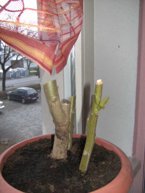 Wintertriebe , wo sind da denn Wintertriebe??? Habe sie ja schon umgetopft. Sie bleibt jetzt im Wohnzimmer stehen , dann kann sie wenigstens schon mal neue Blätter bilden.