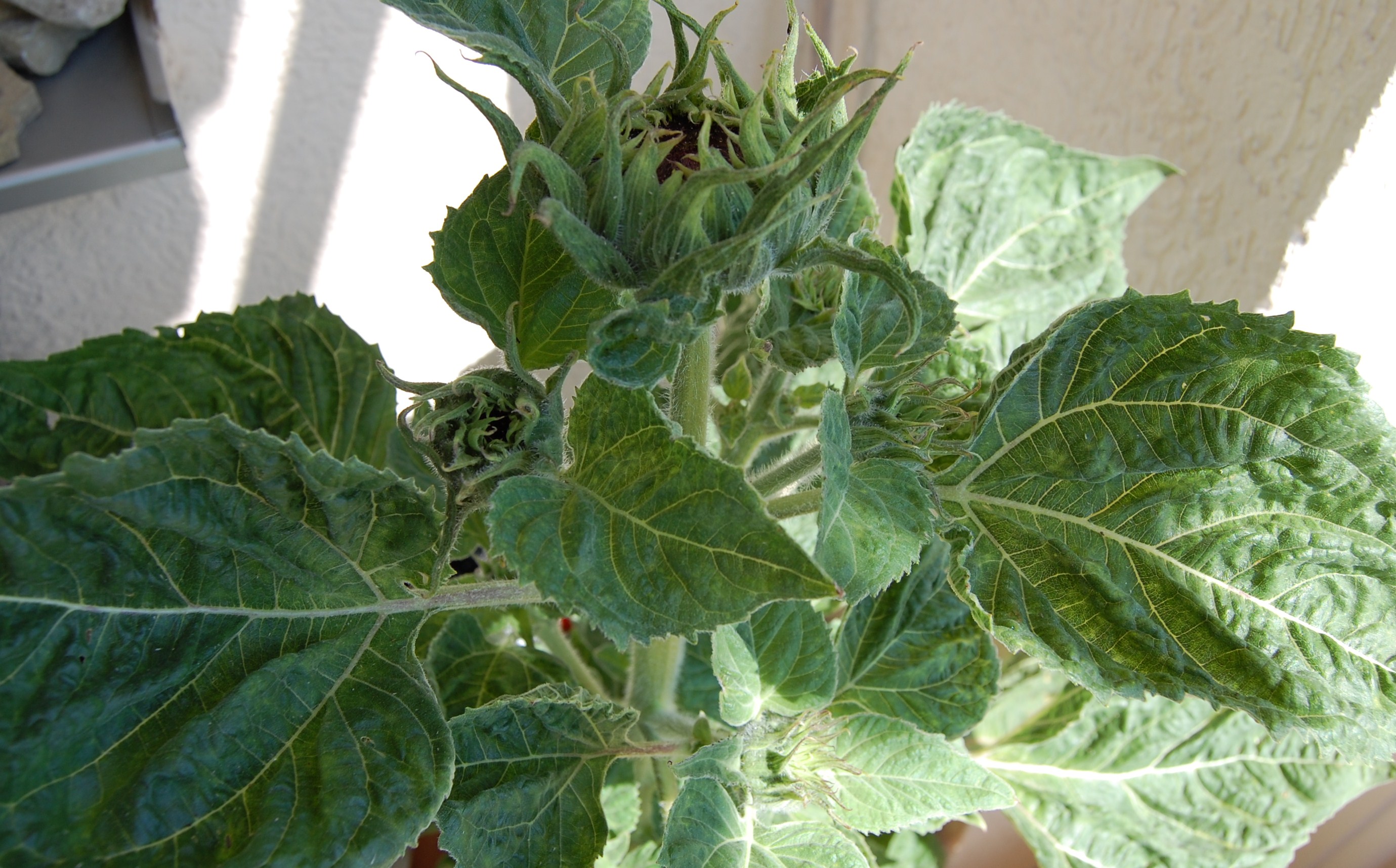 Es geht um eine Sonnenblume die ich im Frühling gepflanzt habe, deren Blätter im oberen Bereich irgendwie verschrumpelt aussehen.