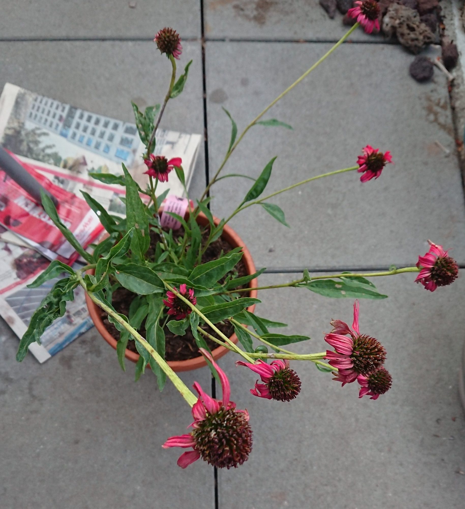 mein Sonnenhut "Tamto Soup" schwächelt seit einiger Zeit. Die Blüten sind recht verkümmert, am Stiel sind weiße Stellen zu sehen und die Blätter wellen sich, werden aber nicht braun. Ich dachte zunächst an Mehltau, da er auch nicht ganz optimal auf dem Balkon Richtung Ost steht. Aber weder Blätter noch Blüten sind befallen, sondern nur die Stiele. Ein Purpur Sonnenhut direkt daneben entwickelt sich unter denselben Bedingungen normal und blüht sehr schön.