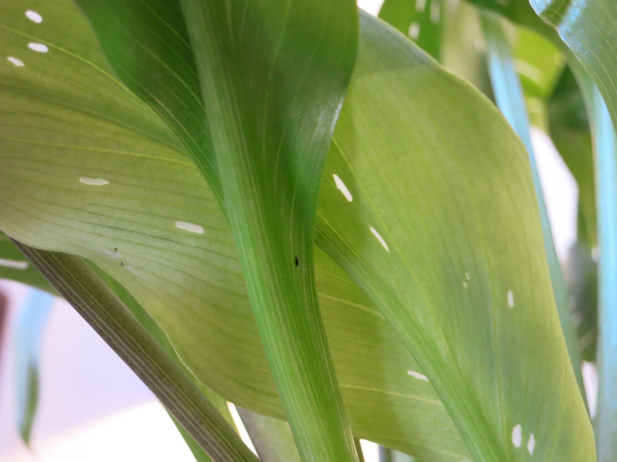 Seit einer Weile habe ich eine Calla, auf der inzwischen wie so kleine schwarze Tupfen zu sehen sind. Das müssen aber irgendwelche Schädlinge sein, denn diese Tupfen gibt es auch in größer und länglicher Form, die auch über die Blätter laufen.