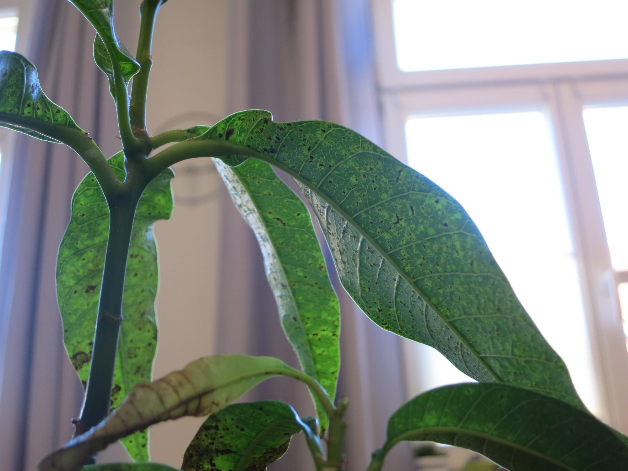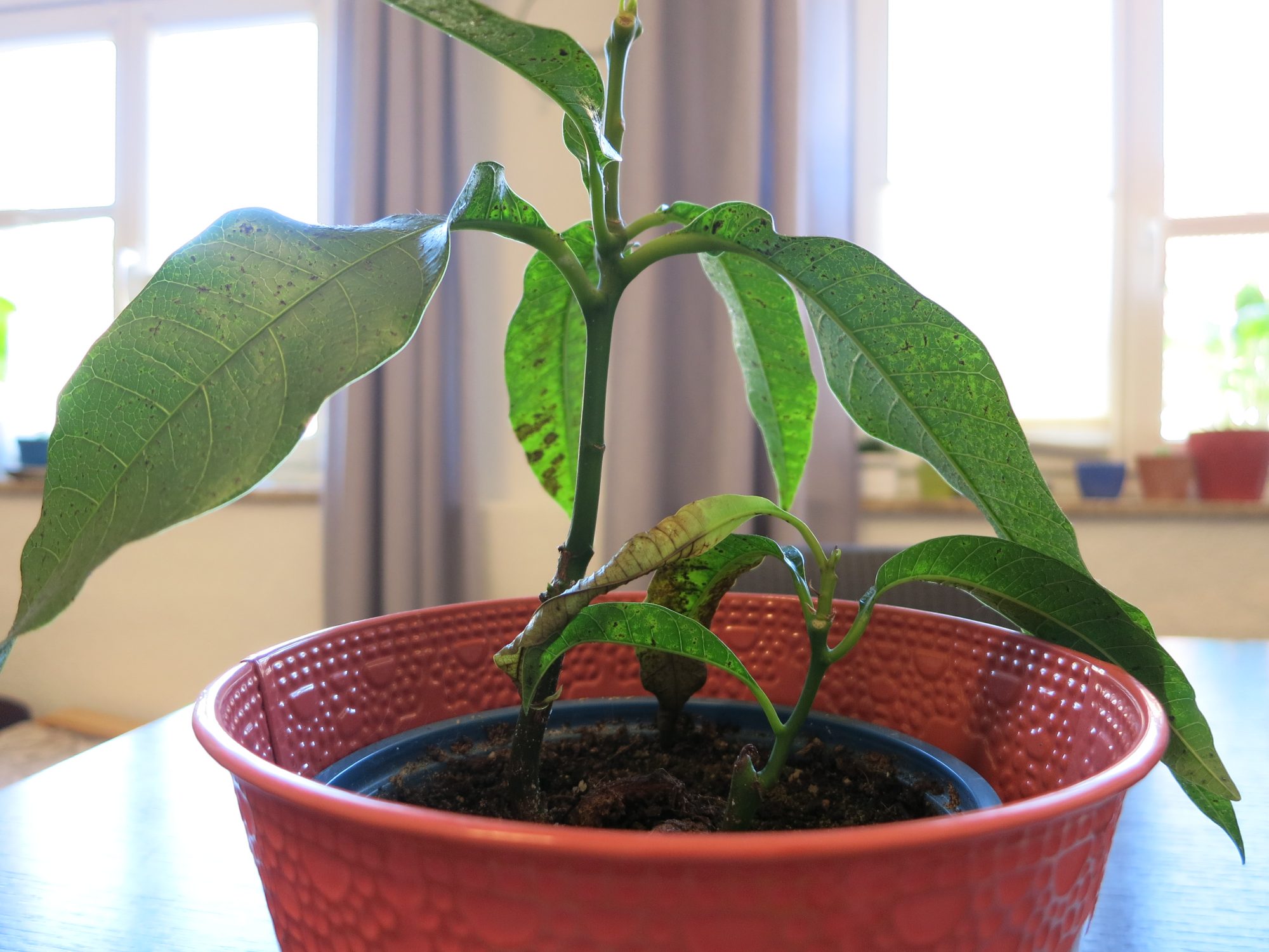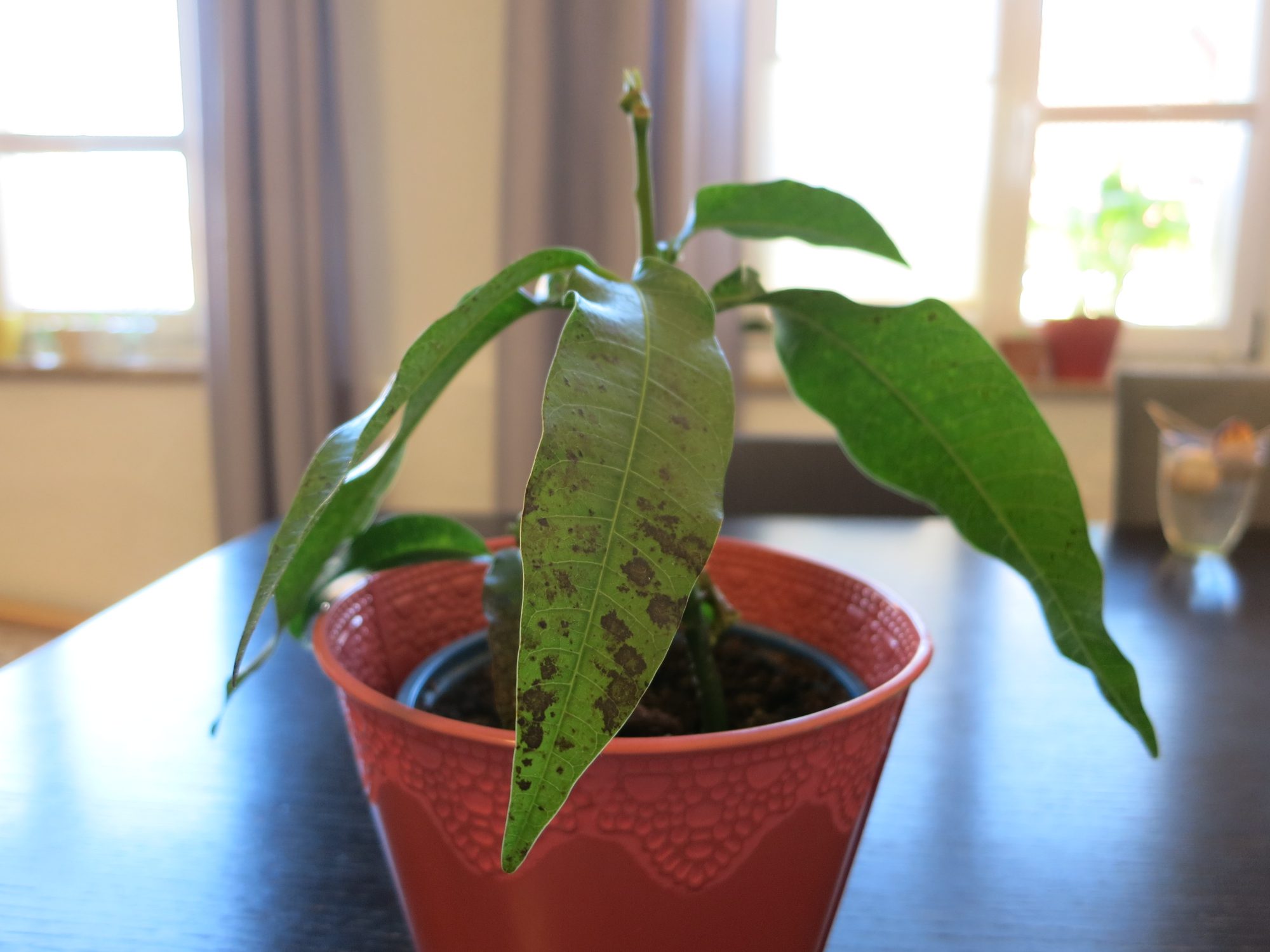 Inzwischen ist es leider noch schlechter geworden. Die oberste Blätterreihe hat die Mango komplett abgeworfen, nachdem die Blätter jeweils ganz braun, trocken, eingerollt und klebrig waren. Auch die verbliebenen Blätter schauen schon schlimm aus.