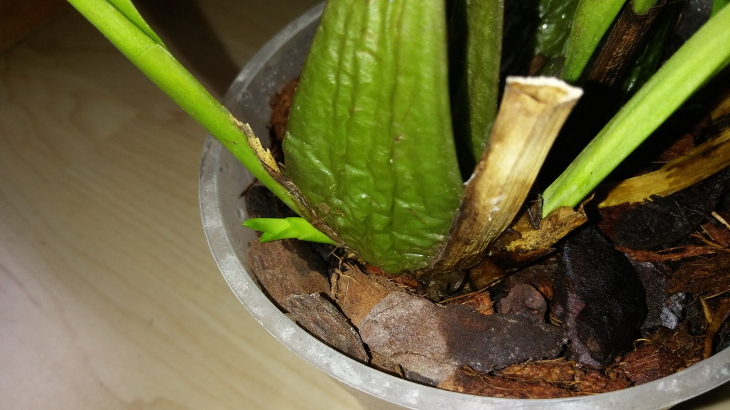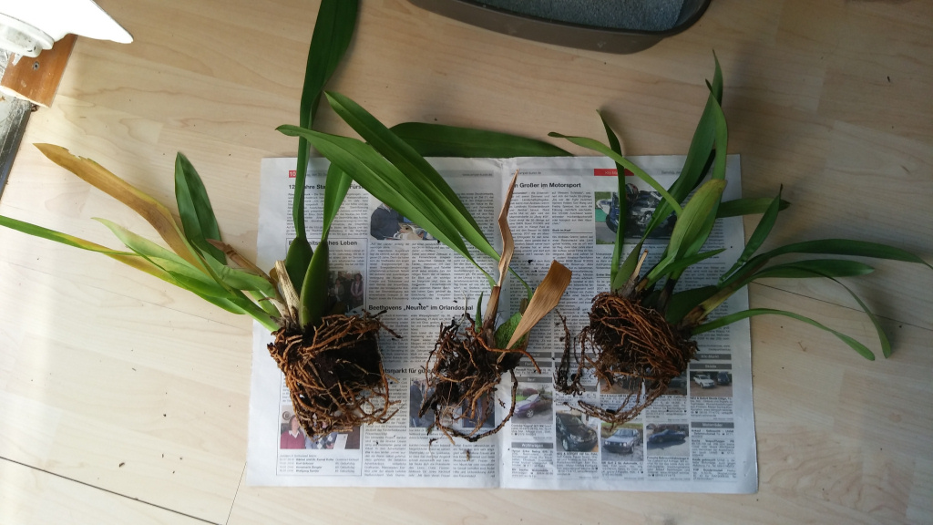 Die armen namenlosen Dinger sterben hier schon lange vor sich hin, jetzt hatte ich endlich mal Zeit, sie aus den Töpfen zu holen und anzusehen. Sieht traurig aus. (Edit sagt, dass ich grad ein Schildchen gefunden habe, mit der Bezeichnung Odontoglossum) Seit Ewigkeiten nicht gegossen und trotzdem klatschnass.. deswegen liegen sie auch gerade nackig auf dem Boden rum, damit das Matschzeug etwas trocknet, damit ich es überhaupt abbekomme. Ich werde niemals wieder irgendwelche Pflanzen in Übertöpfen stehen lassen.