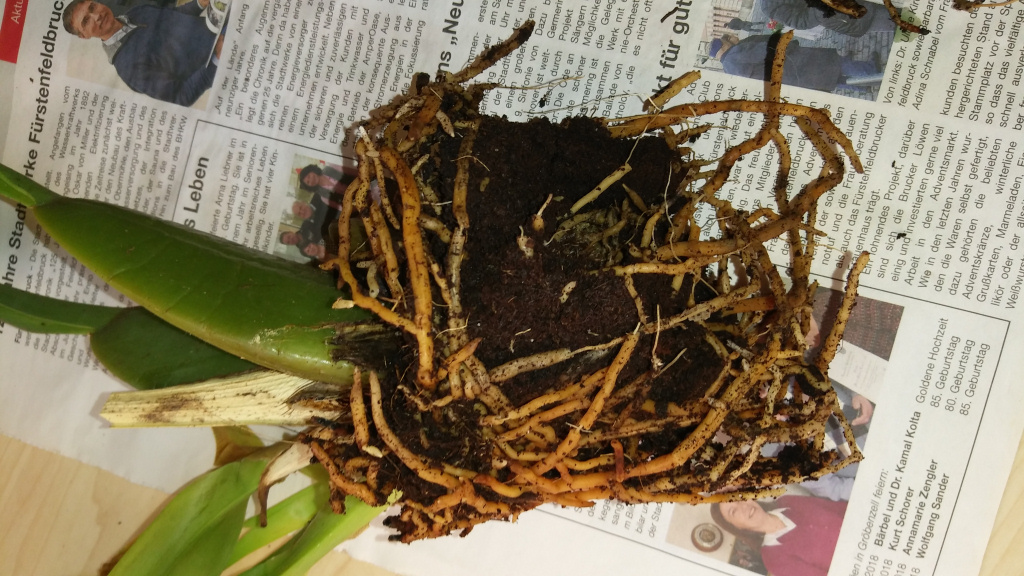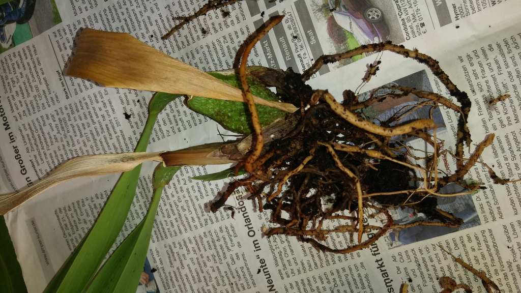 Die Wurzeln sehen wirklich nicht besonders gut aus und kommen mir ein bisschen weich vor, sind aber nicht so direkt matschig, dass ich sicher sagen könnte, das Ding ist tot. Viele Wurzeln sind aber einfach abgerissen, als ich versucht habe, die Matschepampe zu entfernen und ich war jetzt nicht besonders grob. Hab vorher schon eine andere, fitte Spinne umgetopft, die hat kein einziges Wurzelstückchen verloren Ich habe auch ungefähr Null Erfahrung mit solchen Orchideen und weiß nicht mal, wie die Wurzeln aussehen müssen. Die, der's noch gut geht, hat weiße Wurzeln, weil schon länger kein Wasser mehr bekommen.. also sollten die anderen wahrscheinlich auch weißlich sein Jetzt wo sie langsam etwas trocknen, kann man hier und da auch noch weiße Wurzelspitzen aus dem braunen Rest kommen sehen.