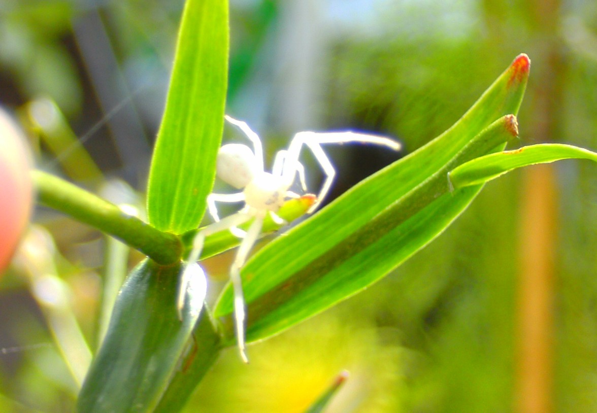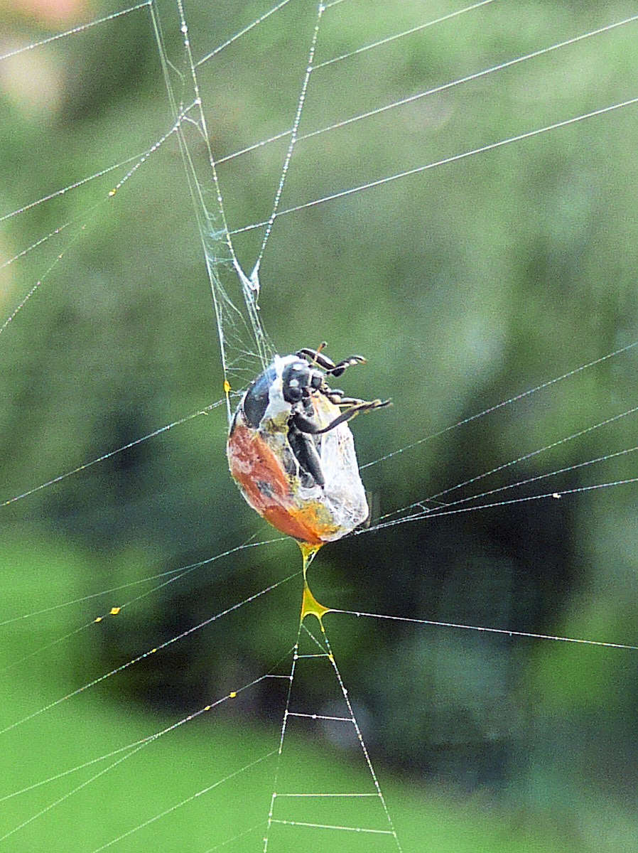 Das ist der Essensabfall von gestern [1. Bild], heute verspeist sie (?) einen Marienkäfer [2. Bild] und Töchterchen sitzt nebenan und hat noch nichts zu fressen [3. Bild]. Übrigens lebt der Marienkäfer noch ,obwohl sie jetzt - 2 Stunden später- mit der Mahlzeit fertig ist und von ihm weggekrabbelt ist. Er (der M.) ist eingesponnen [4. Bild], wackelt aber noch immer mit den Beinchen [5. Bild]. Grausam!