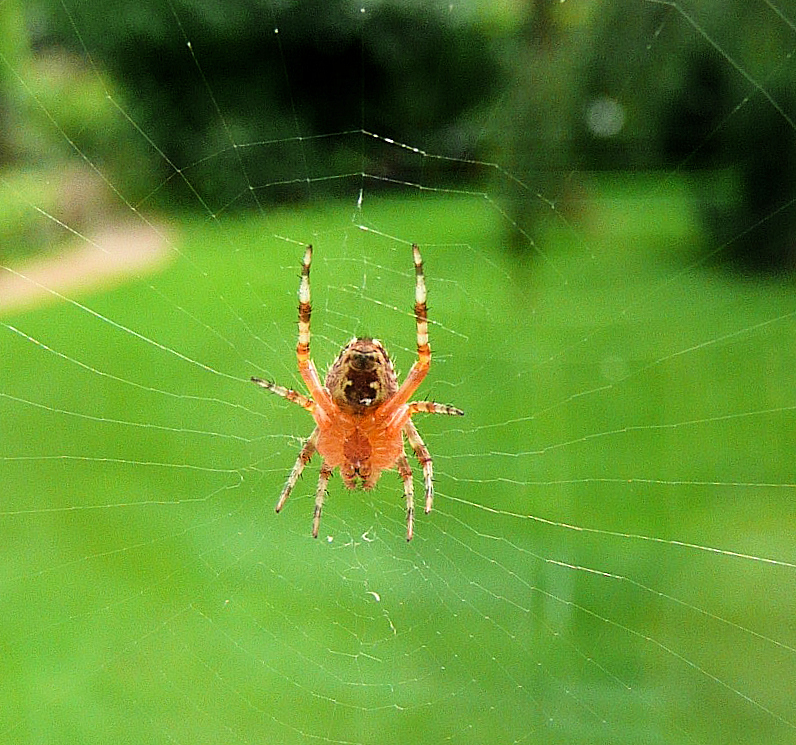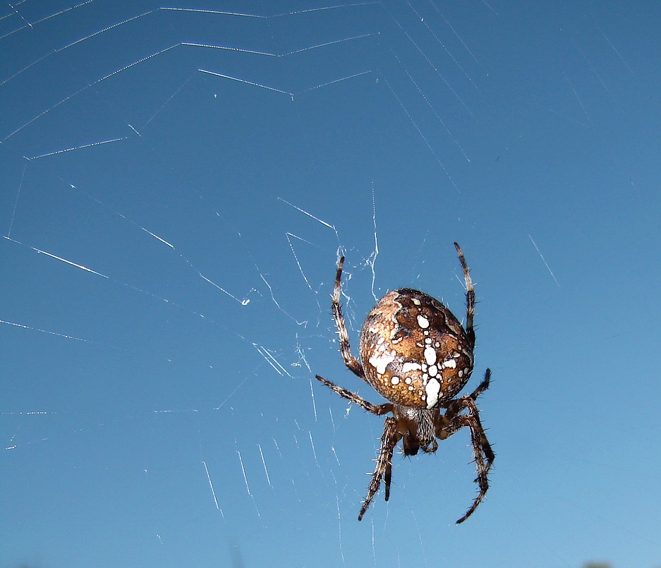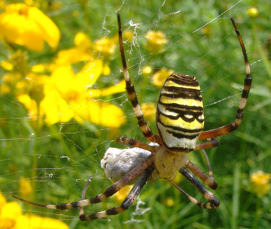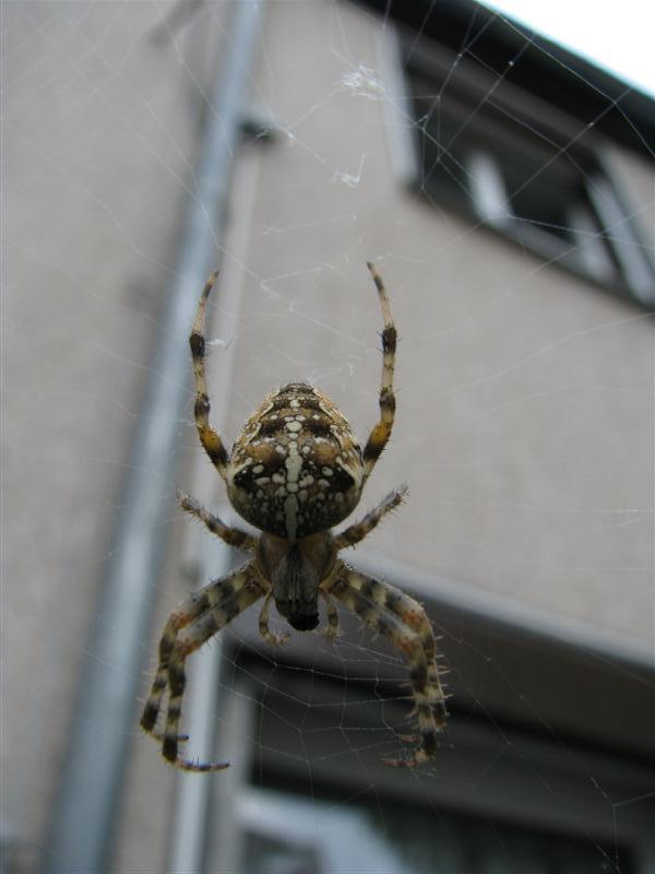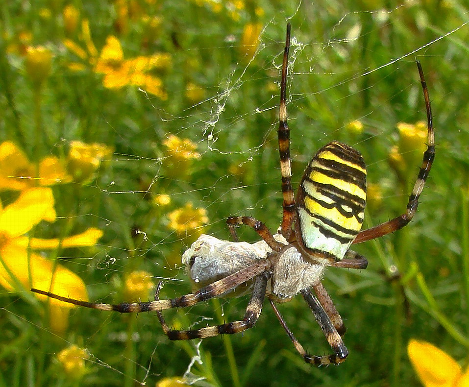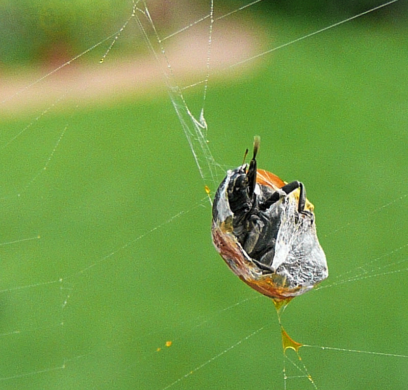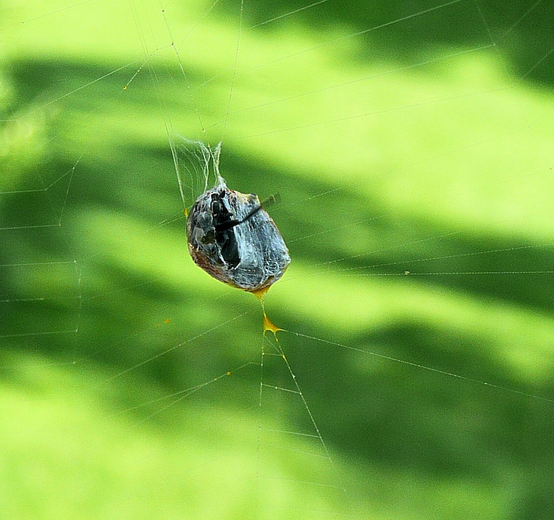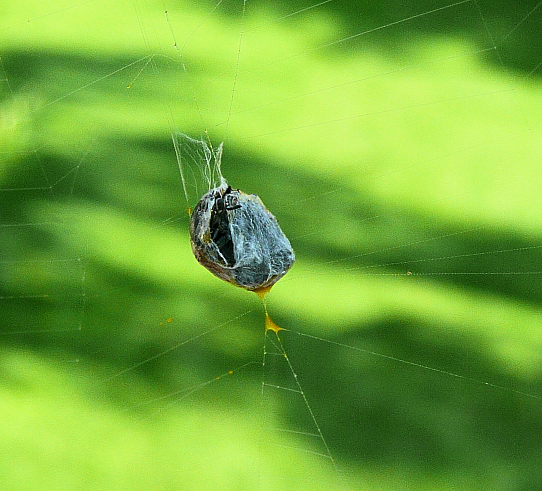 Nun scheint er sich befreien zu wollen, das Loch wird immer größer, Mundwerkzeuge und Beinchen sind frei, aber der Rest bleibt eingesponnen. Hat die Spinne ihn denn überhaupt ausgesaugt? Oder hat sie von ihm abgelassen, weil er nicht schmeckt???