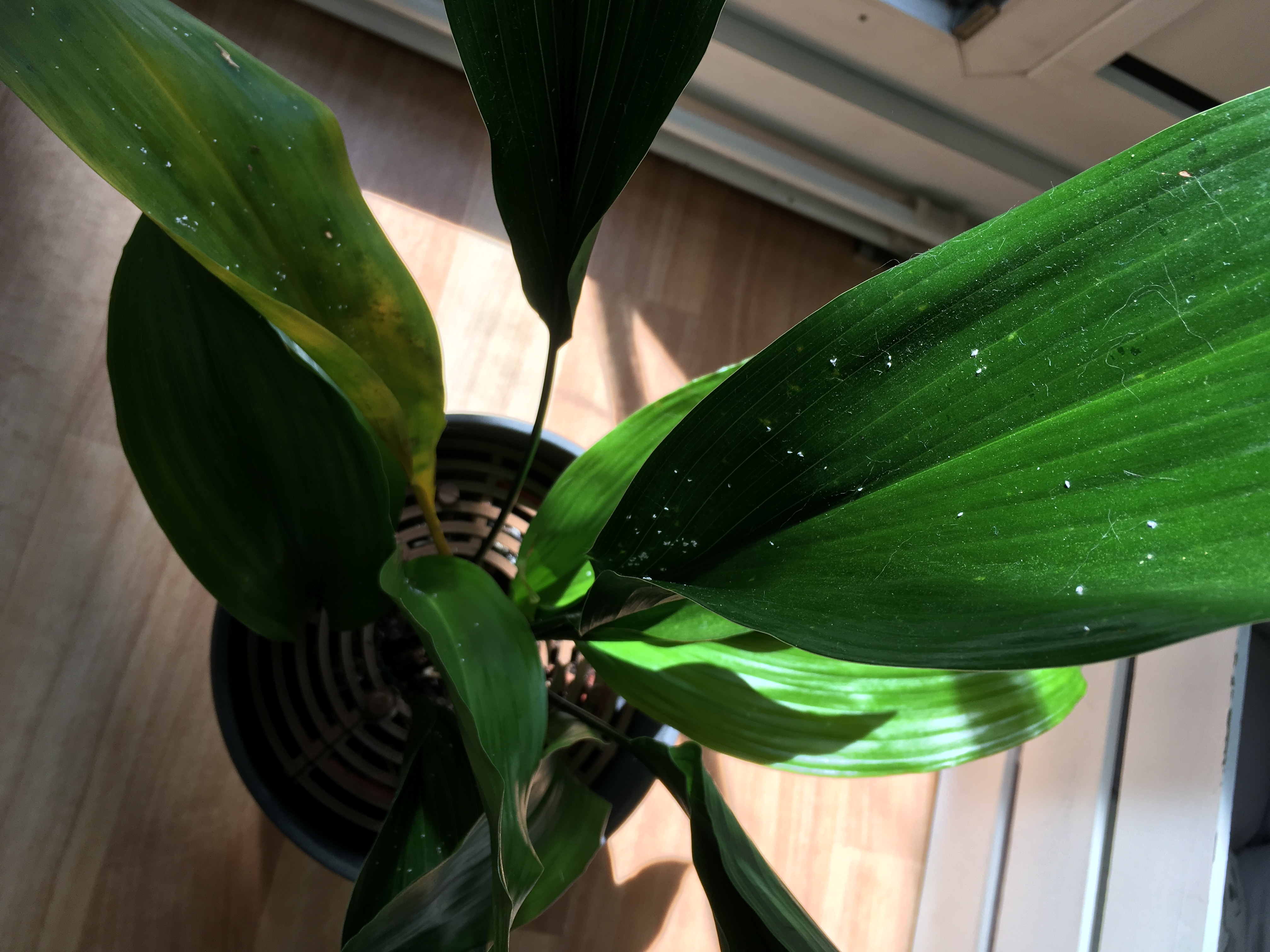 Und weil wir schon dabei sind - an meiner Schusterpalme habe ich viele kleine weiße Punkte, die Blätter werden dort nach und nach vom Stiel her gelb.